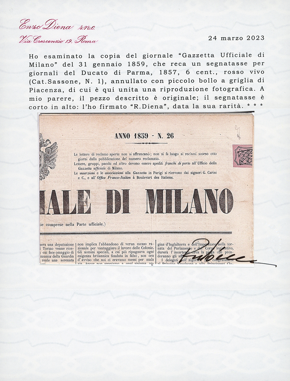 PARMA 1852/1859 - Cinque lettere e due giornali con affrancature del periodo. Notate alcune buone/ottime presenze e due certificati Diena. Elevato valore di catalogo, qualità mista. Ottimo per dettaglio, occasione.