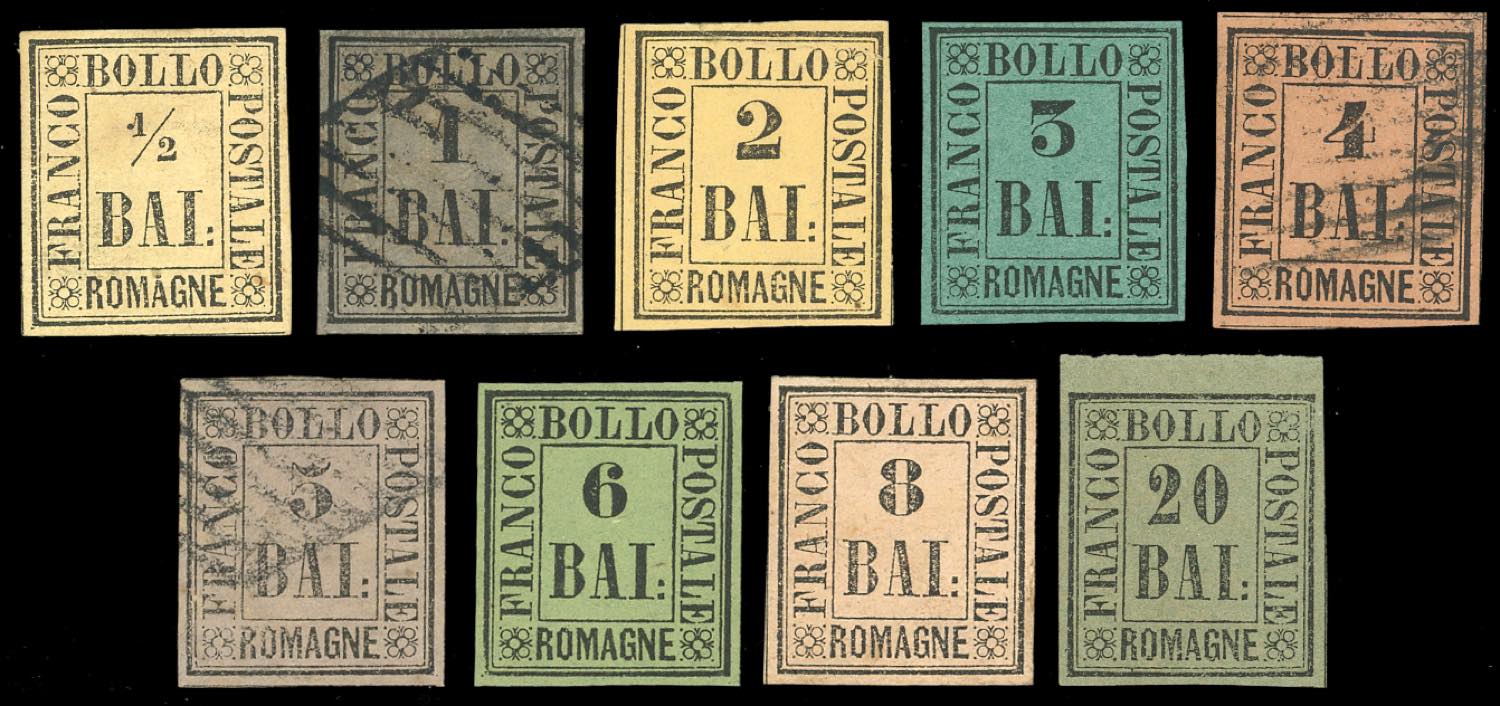 ROMAGNE 1859 - La serie completa (1/9), nuovi gomma originale o usati, perfetti. Diversi esemplari firmati da noti periti.