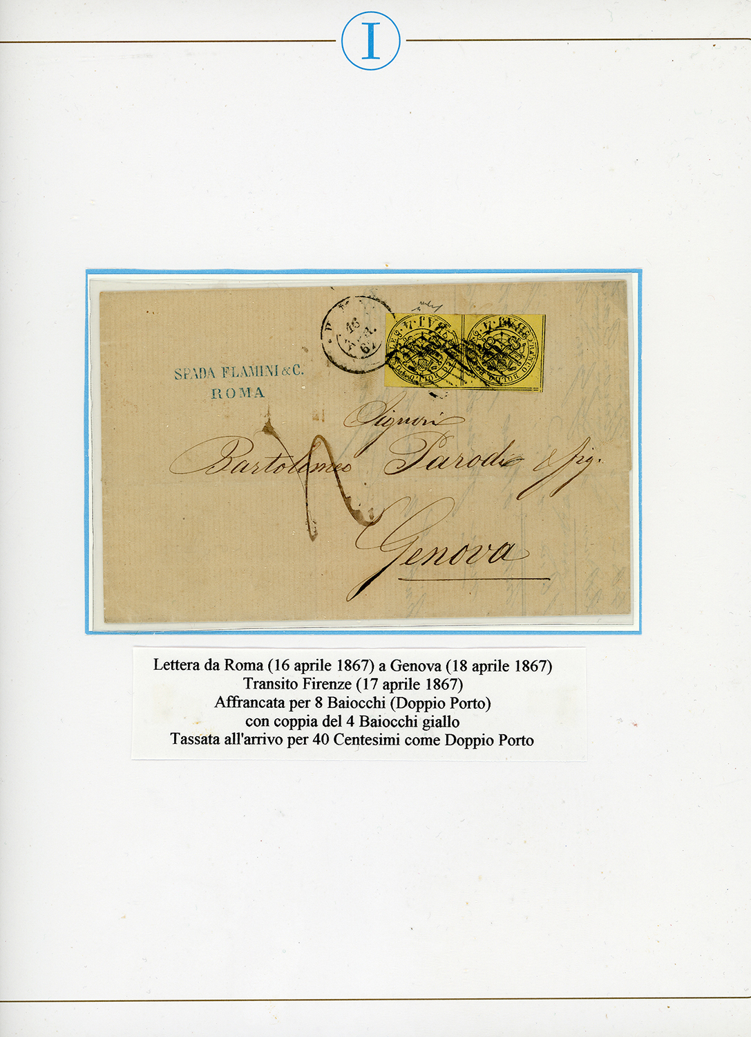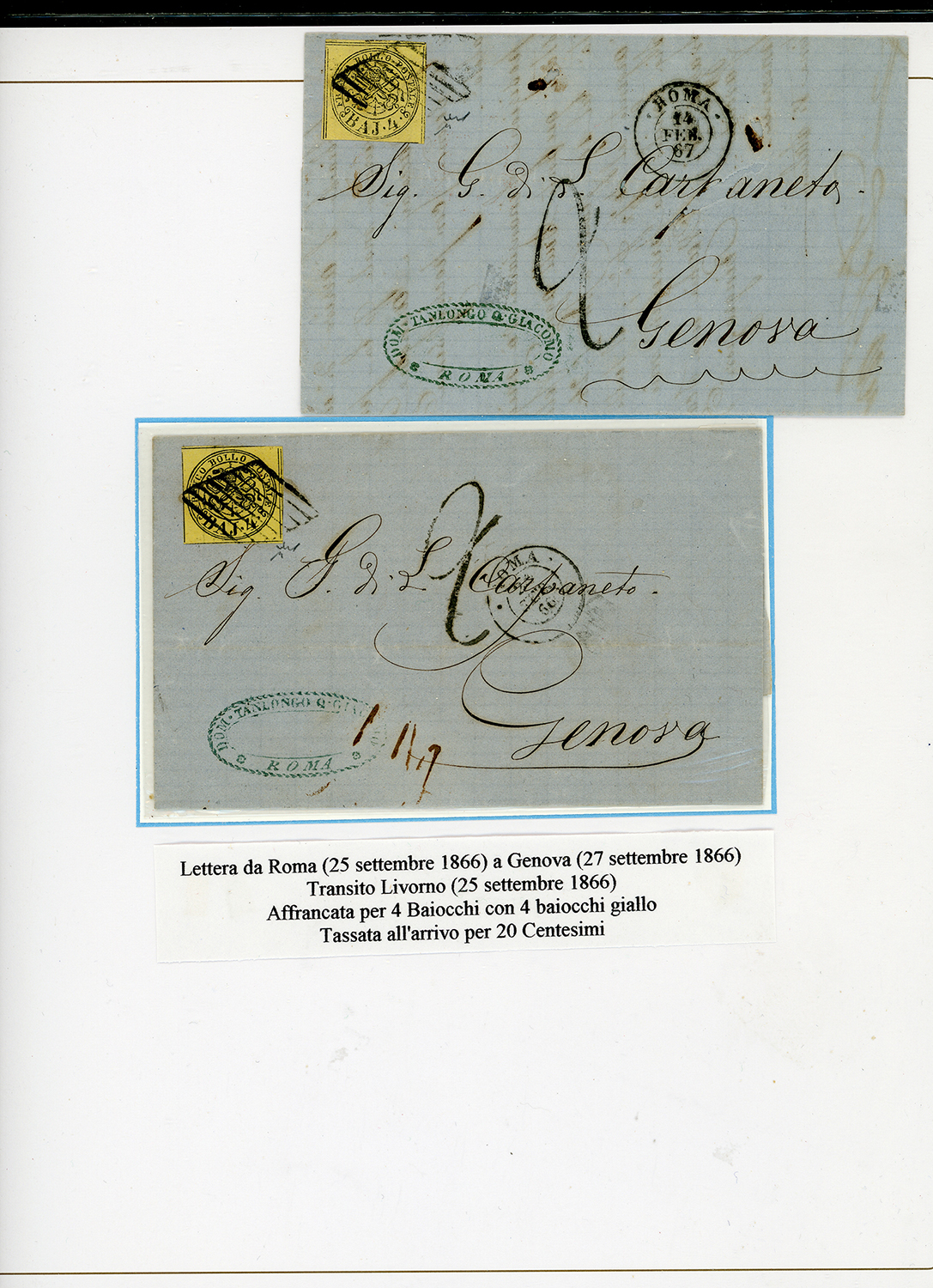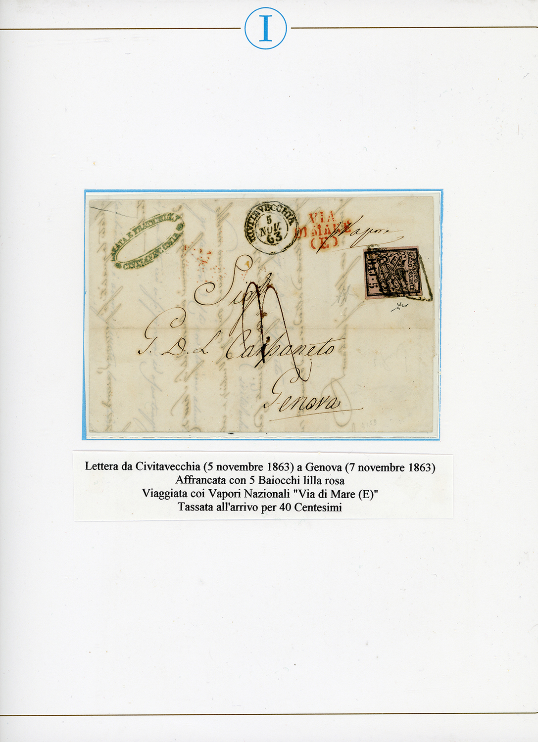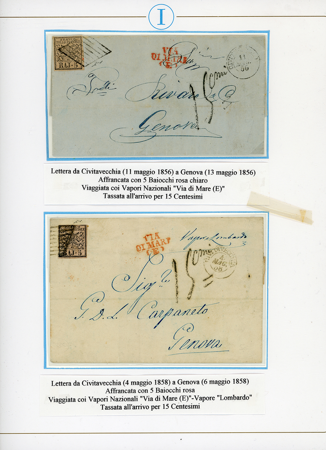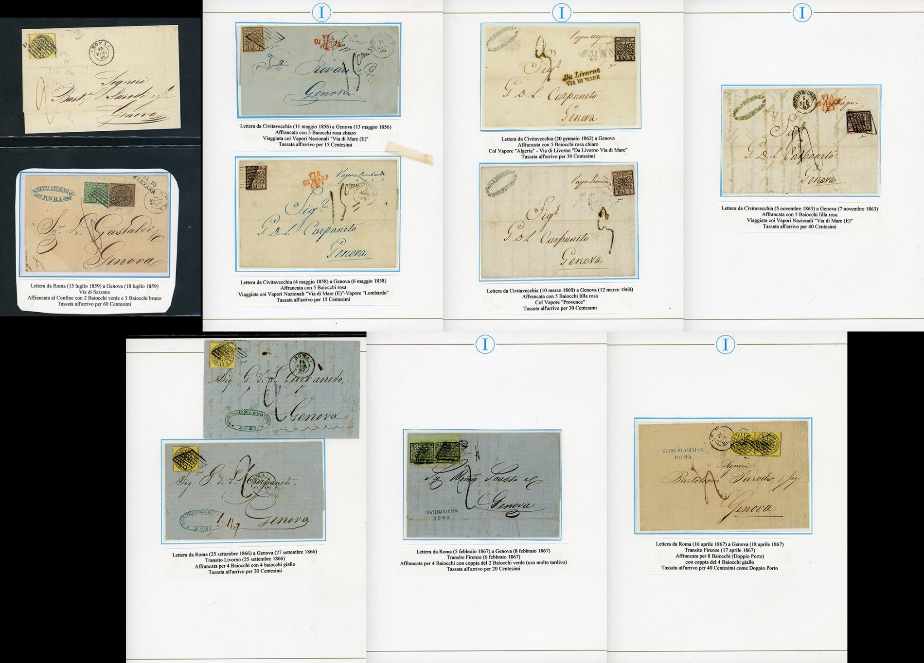 STATO PONTIFICIO 1856/1867 - Bell'insieme di 11 lettere affrancate, tutte vie di mare dirette a Genova, quasi tutte montate su fogli da esposizione con didascalie. Interessanti. Ex coll. Imperato.
