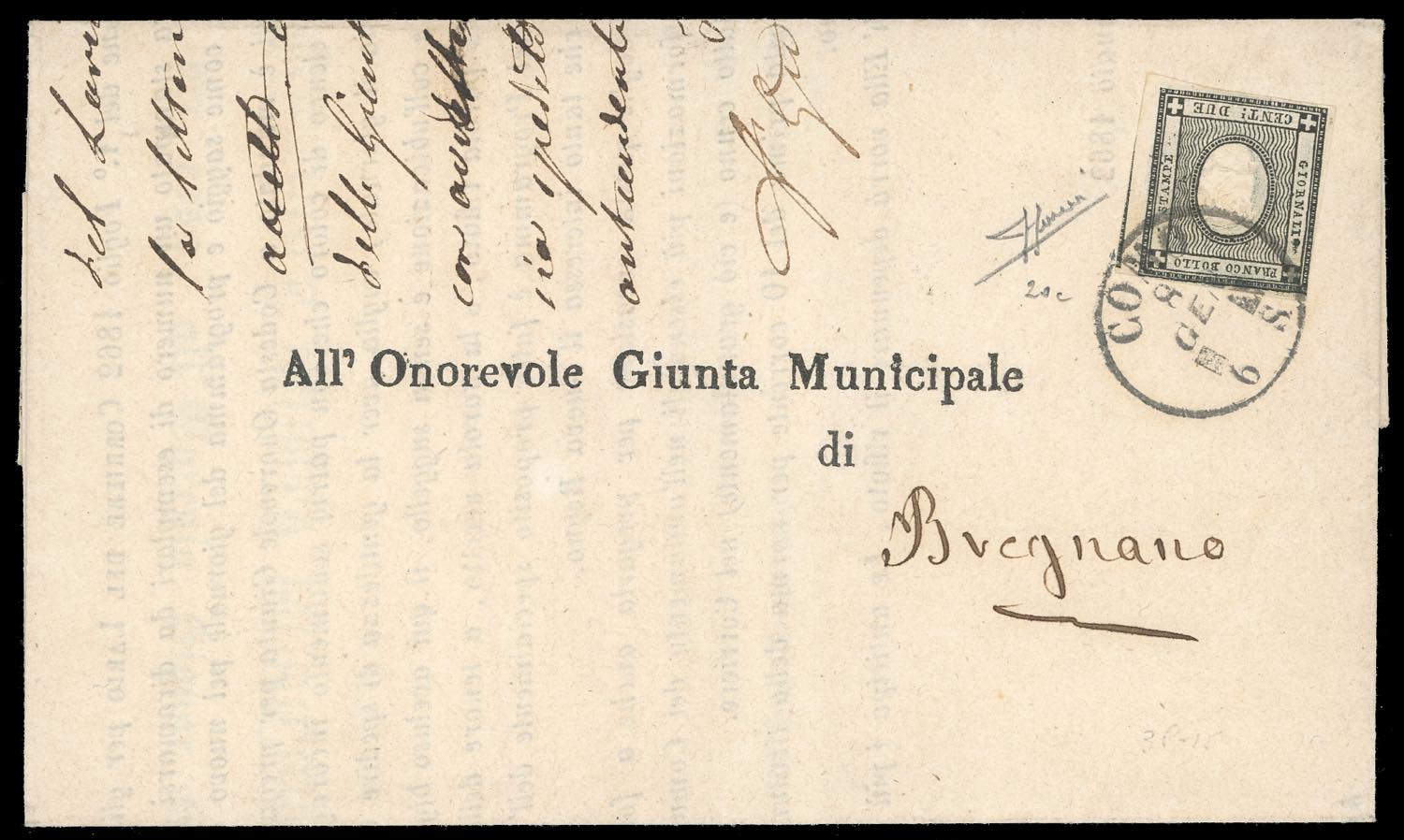 SARDEGNA/REGNO D'ITALIA 1862/1863 - Quattro lettere e un frontespizio affrancati con i centesimi per stampati. Notata una buona varietà di tinte e un'interessante varietà. Per specialista. Un certificato Sorani.
