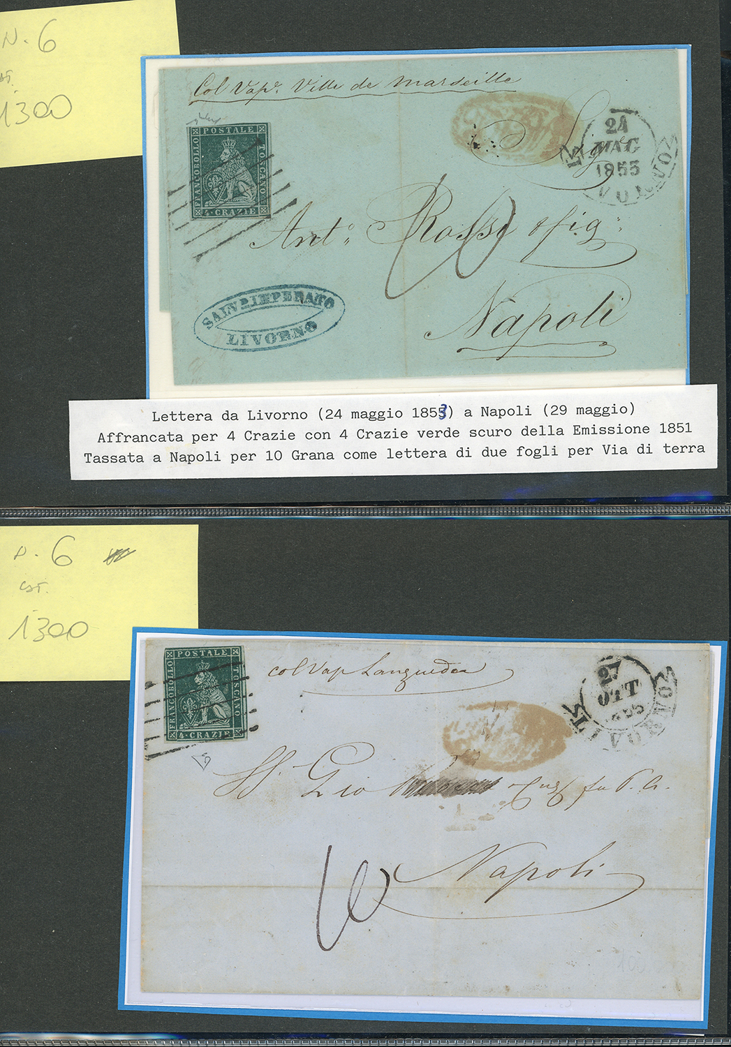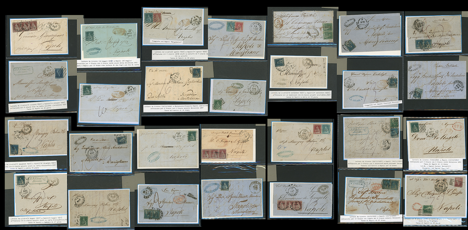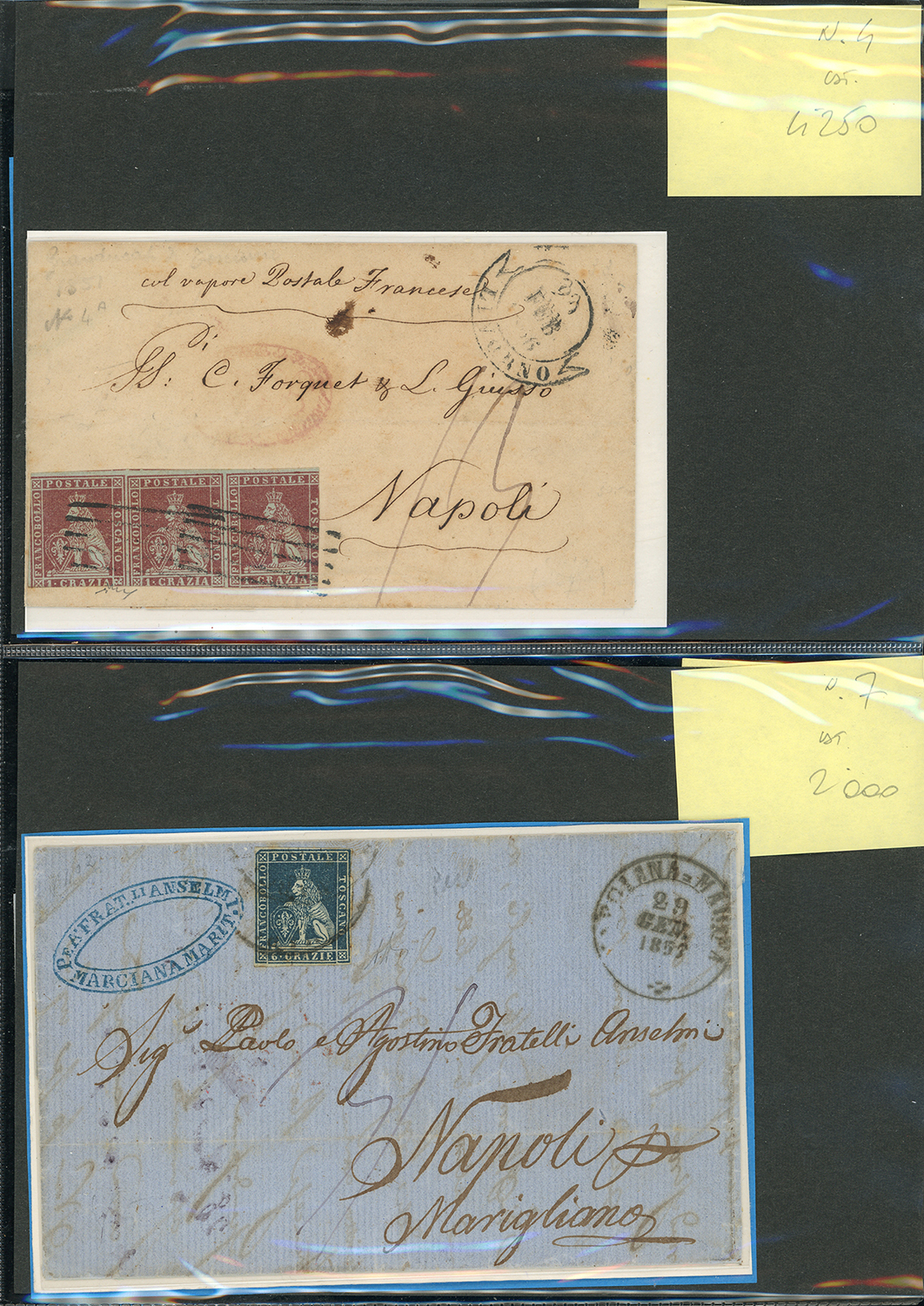 TOSCANA VIA DI MARE 1852/1858 - Bella ed interessante collezione di 28 lettere affrancate dalla Toscana al Regno di Napoli, trasportate via di mare. Buona varietà di affrancature e di indicazione dei diversi vapori postali. Insieme di difficile ripetibilità, ideale sia per lo specialista che per il dettaglio. Elevatissimo valore di catalogo. Ex coll. Imperato.