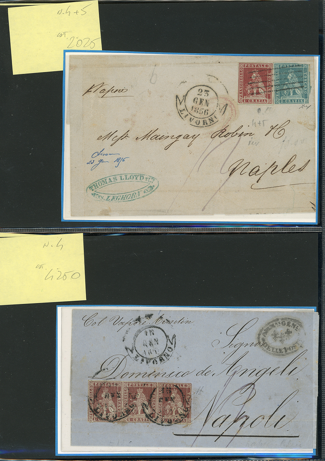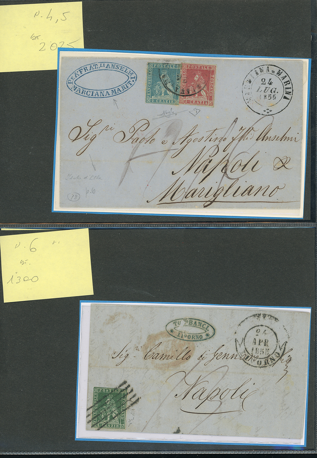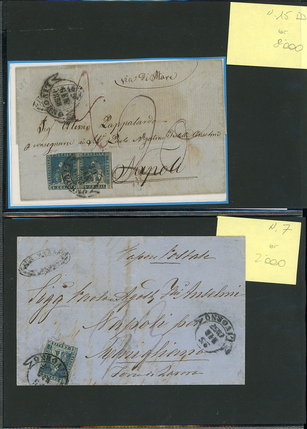 TOSCANA VIA DI MARE 1852/1858 - Bella ed interessante collezione di 28 lettere affrancate dalla Toscana al Regno di Napoli, trasportate via di mare. Buona varietà di affrancature e di indicazione dei diversi vapori postali. Insieme di difficile ripetibilità, ideale sia per lo specialista che per il dettaglio. Elevatissimo valore di catalogo. Ex coll. Imperato.