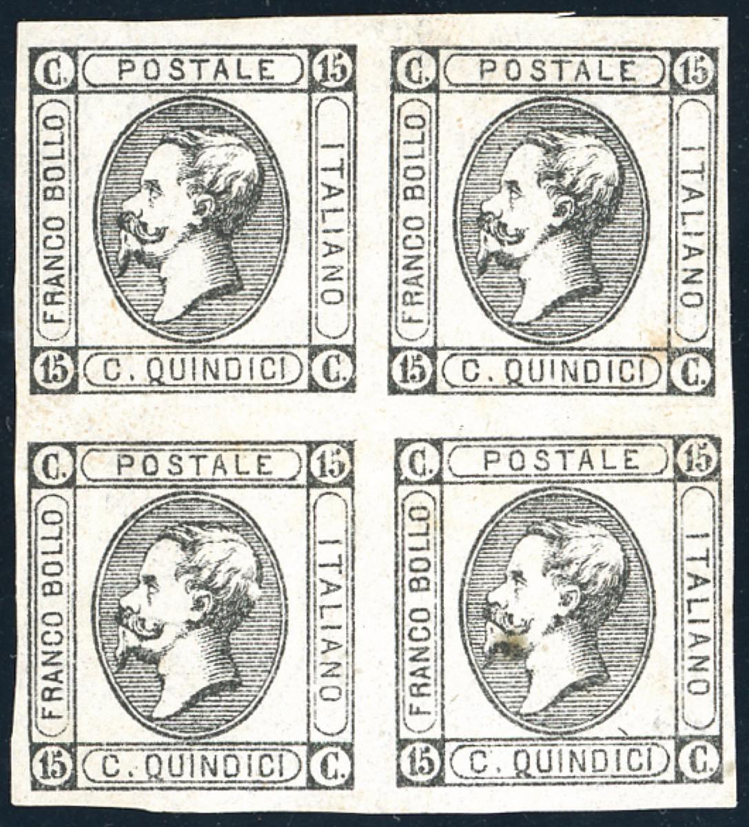 1863 - 15 cent. Litografico, I tipo (12), prova di macchina in nero, blocco di 4, senza gomma come sempre, due esemplari perfetti e due ... Read more