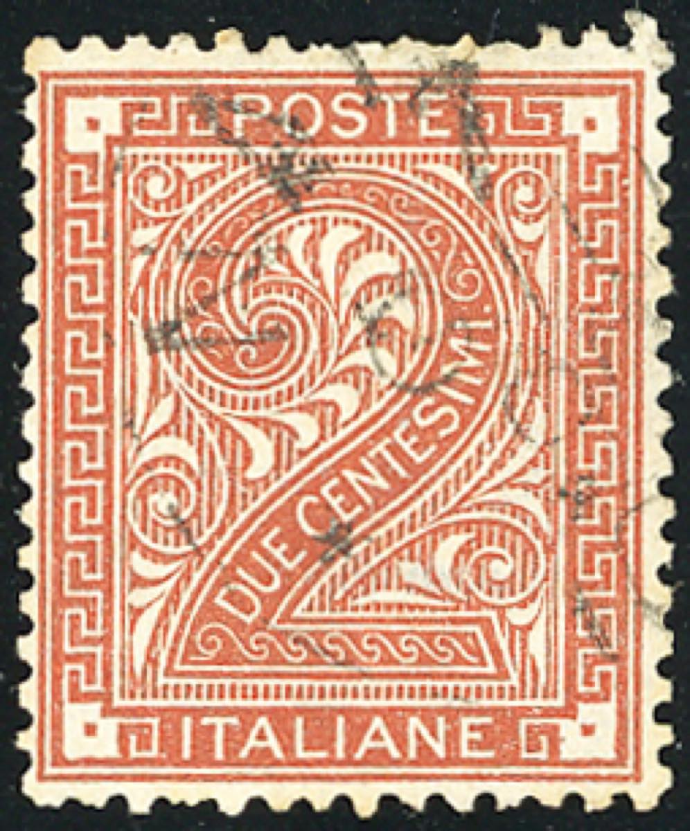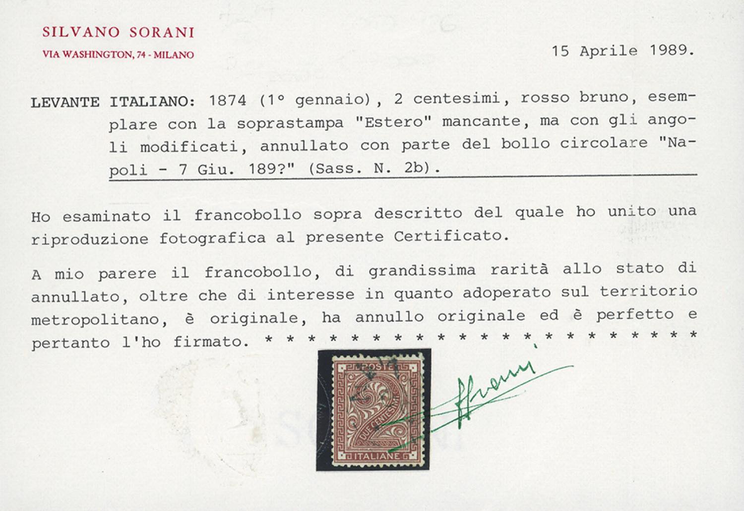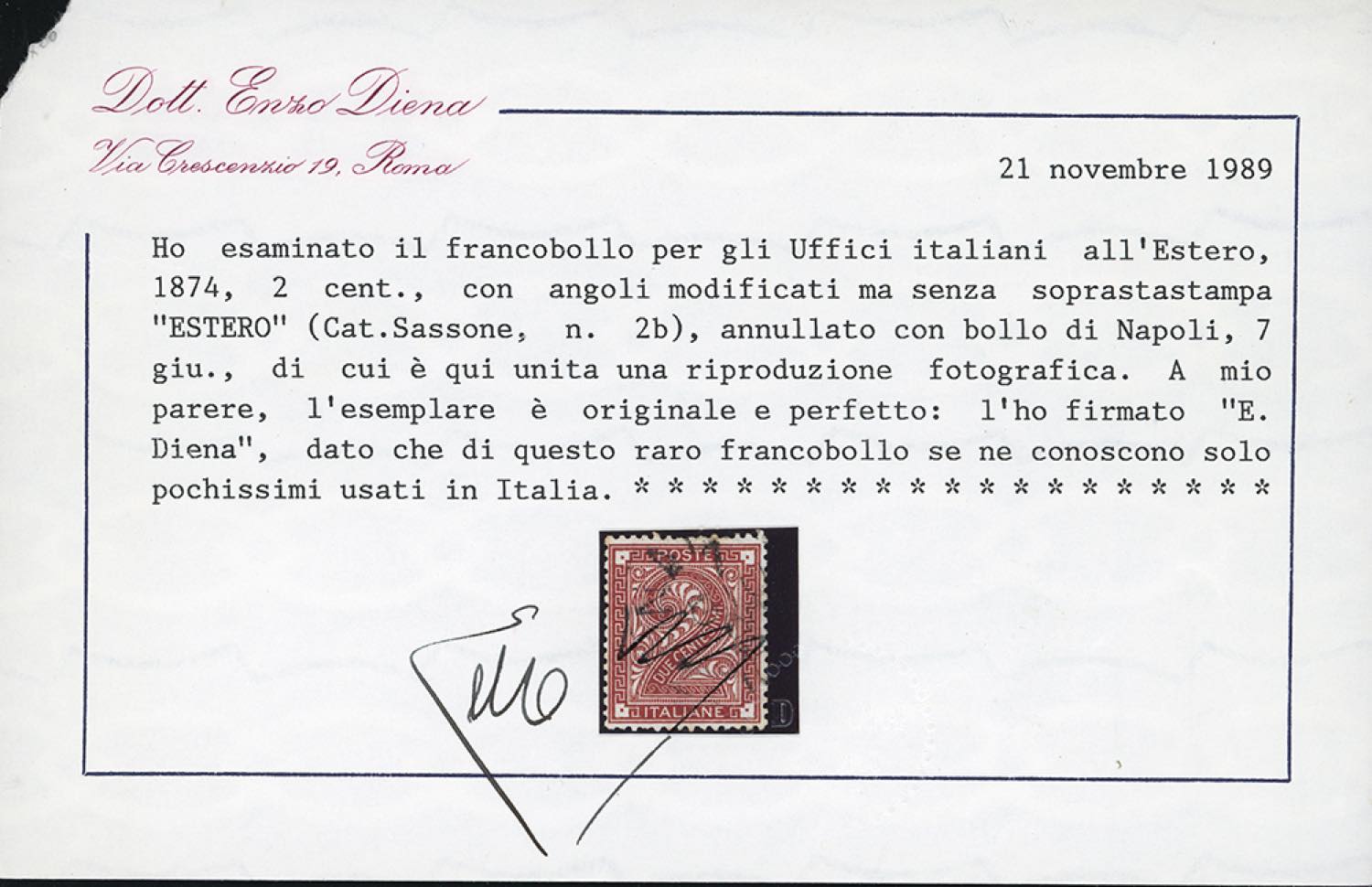 1874 - 2 cent. De La Rue, ANGOLI MODIFICATI per l'emissione del Levante, senza soprastampa (T15A), perfetto, usato a Napoli 7/6. Rarità assoluta del Regno d'Italia. Dei soli QUATTRO ESEMPLARI NOTI, l'unico usato a Napoli. Cert. E.Diena e Sorani.