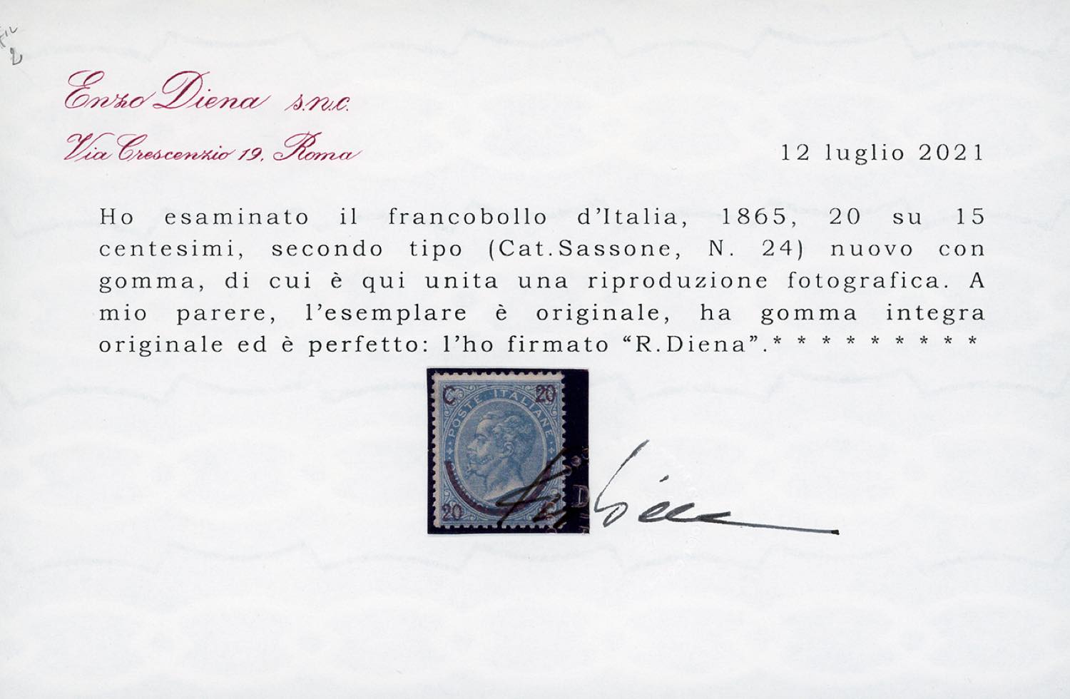 1865 - 20 cent. su 15 cent. Ferro di cavallo, II tipo (24), nuovo, gomma originale integra, perfetto. Molto fresco e raro. Cert. Ferrario e Diena.