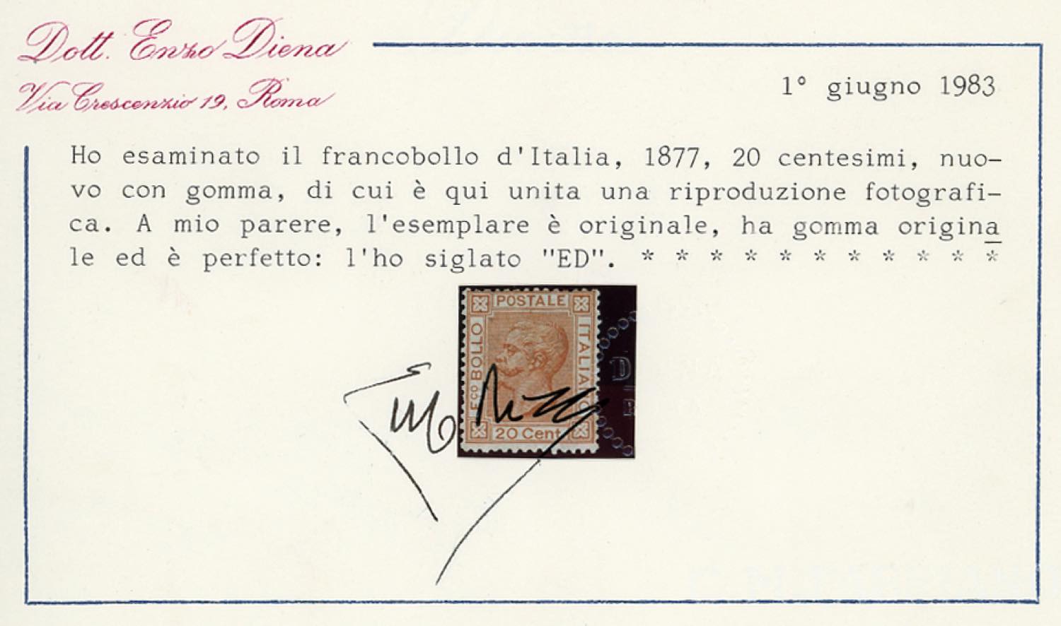 1877 - 20 cent. ocra arancio (28), discreta centratura, gomma originale, perfetto. Molto fresco. A.Diena, cert. E.Diena e Finanziario ... Read more