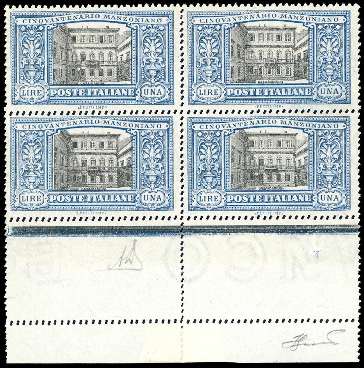 1923 - 1 lira Manzoni, doppia dentellatura (155f), blocco di quattro, bordo di foglio, gomma originale integra, perfetto e molto fresco. ... Read more