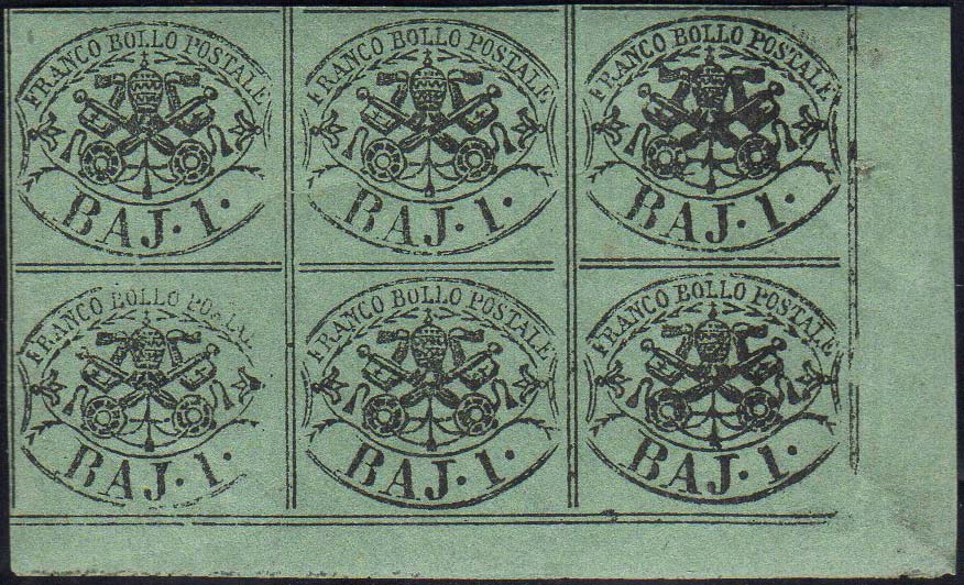 1858 - 1 baj verde scuro, I composizione (2A), blocco di sei, angolo di foglio, gomma originale, integra per due esemplari, perfetto. Bello e raro! G.Oliva. Ex coll. Andreotti.