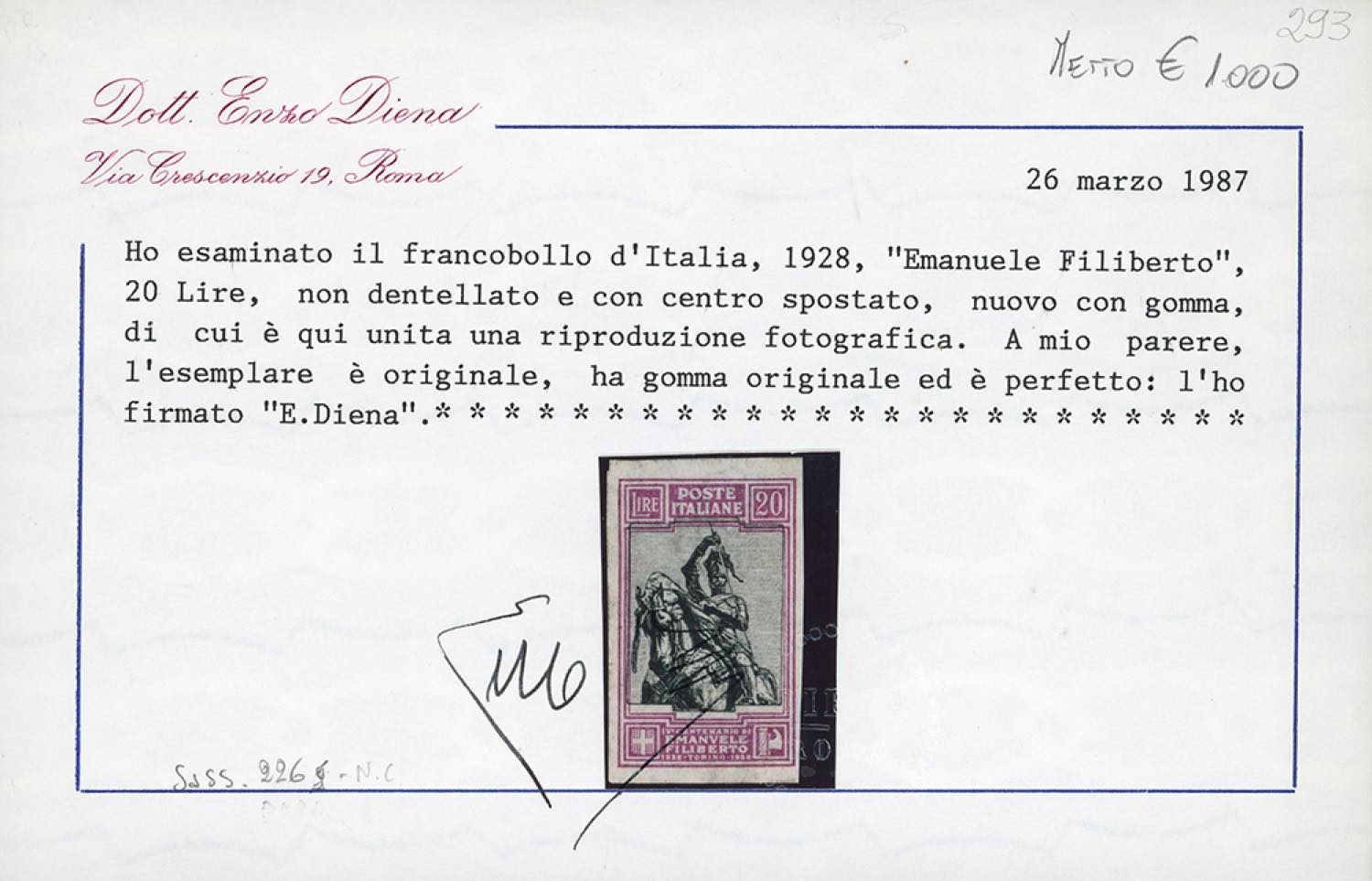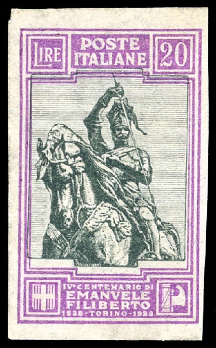 1928 - 20 lire Emanuele Filiberto (238), non dentellato e con centro spostato in alto, gomma originale, perfetto. Rara varietà, non ... Read more