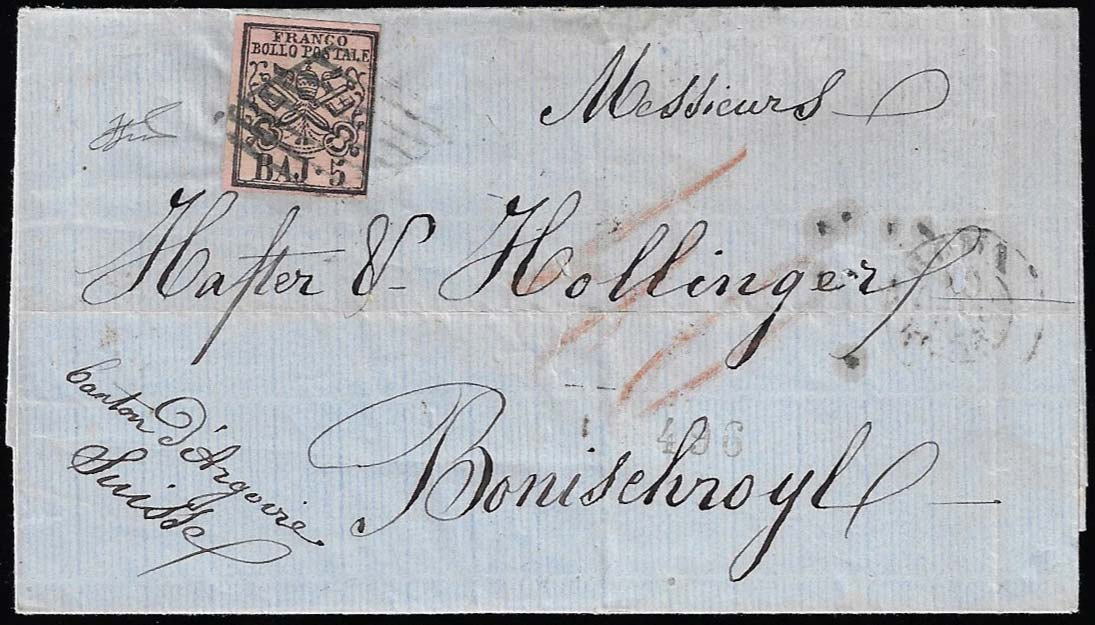 1863 - 5 baj rosa vinaceo (6Aa), giusto a destra, su sovracoperta di lettera da Roma 30/12/1863 a Bonischroyl, Cantone d'Argovia, Svizzera, ... Read more