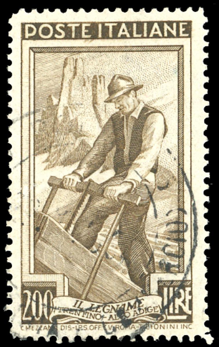 1950 - 200 lire Lavoro, dent. 14 x 14, filigrana posizione SA (652/I,Sass.Spec.136-SA), usato, perfetto. Cert. Carraro.