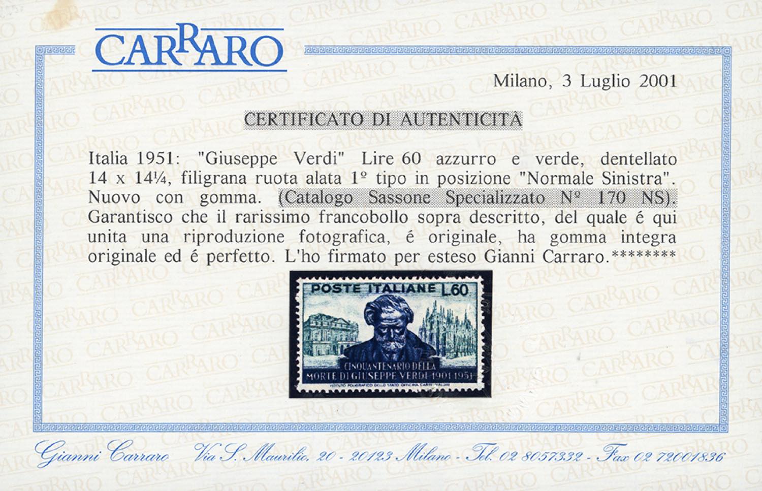 1951 - 60 lire Verdi, dent. 14 x 14 1/4, filigrana posizione NS (679,Sass.Spec.170-NS), gomma originale integra, perfetto. Molto raro. Cert. Carraro.
