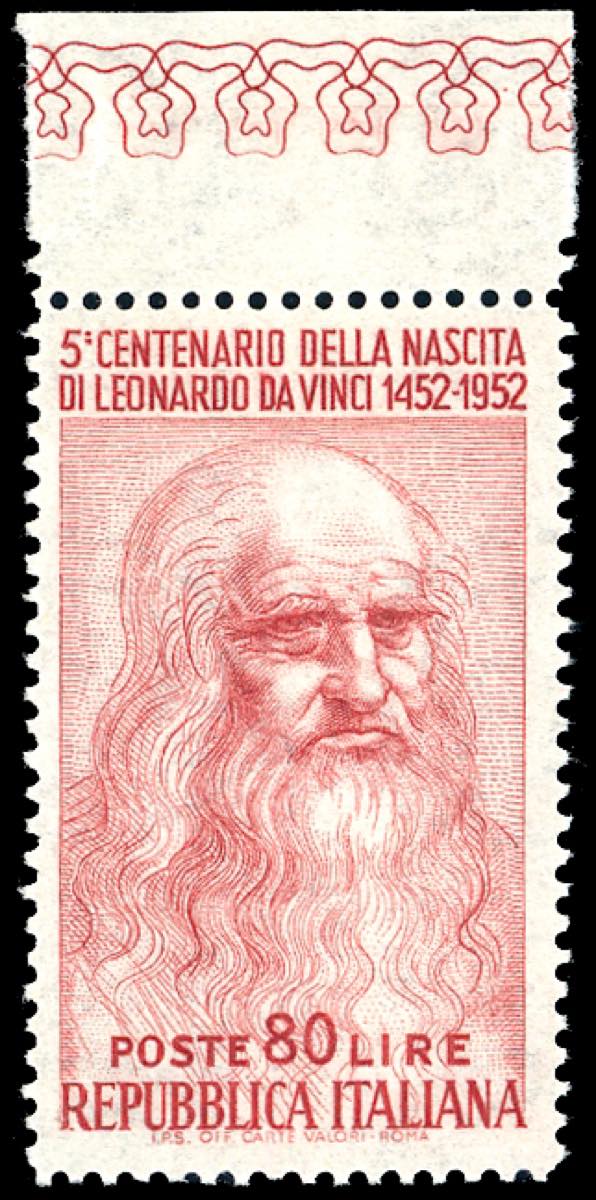 1952 - 80 lire Leonardo, al verso la dicitura "B" relativa alla validità postale (688,riquadro;Sass.Spec.P20B), bordo di foglio, gomma originale integra, perfetto. Interessante e raro. Ferrario, fotocopia cert. E.Diena.
