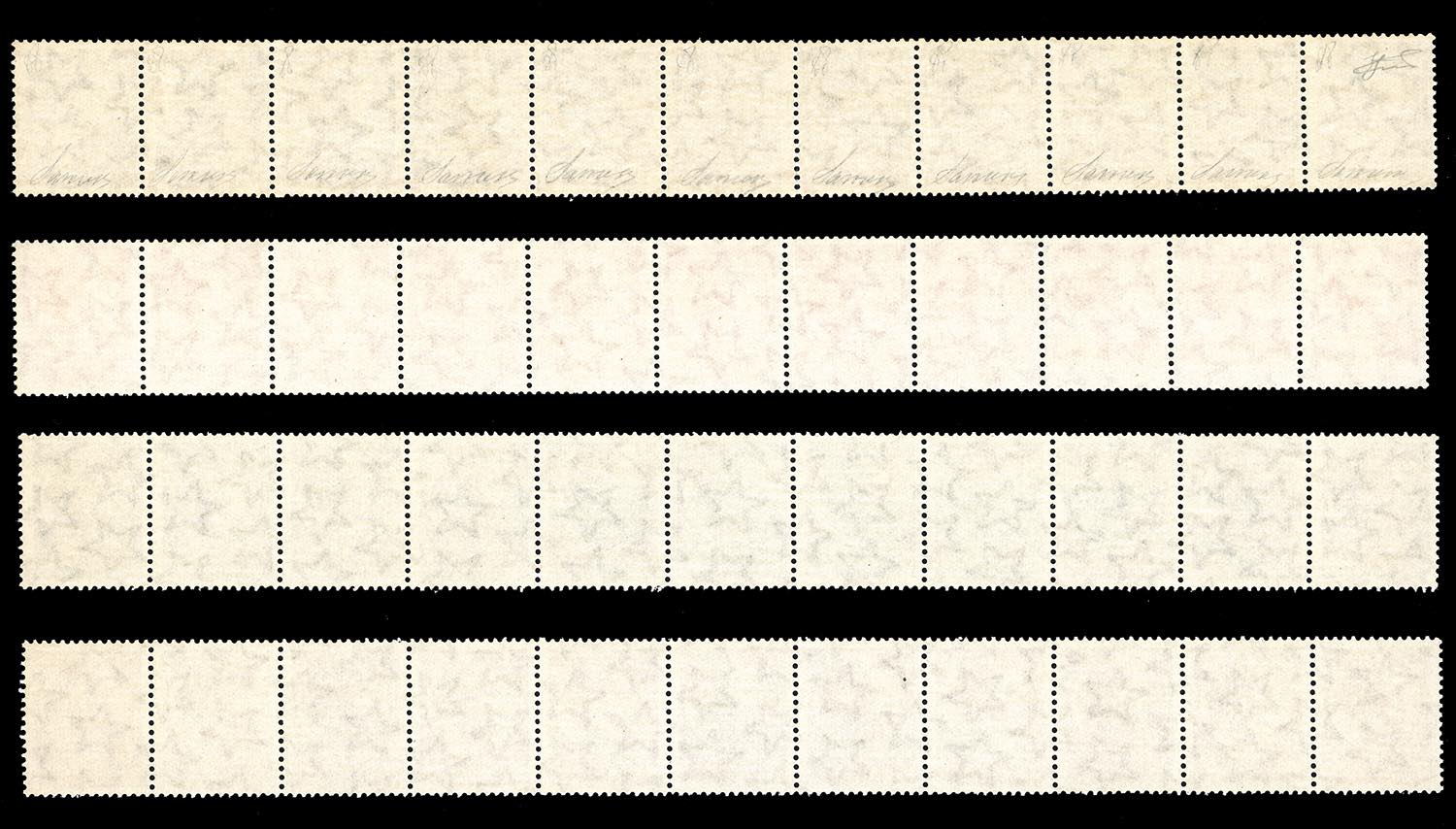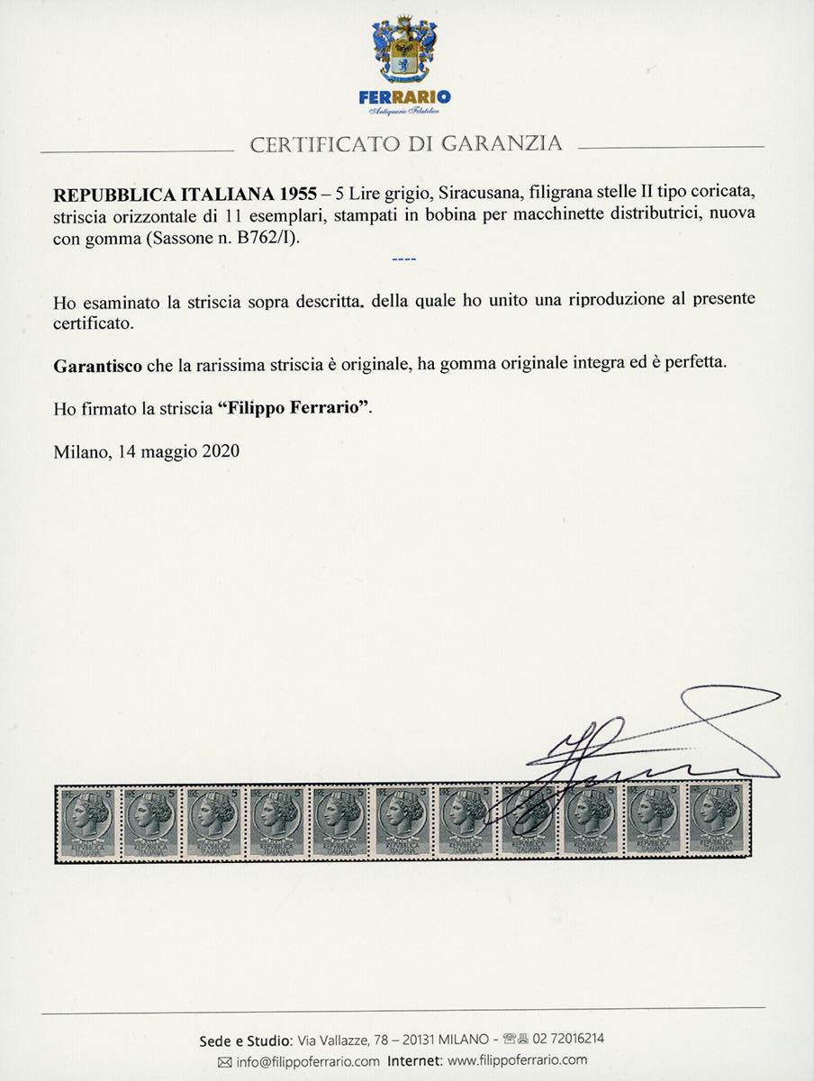1955 - Siracusana, francobolli in bobina, filigrana stelle II tipo coricata, serie completa in strisce di 11 esemplari (B762/I-B769I), gomma originale integra, perfetta. Cert. Ferrario pe la rara striscia del 5 lire.