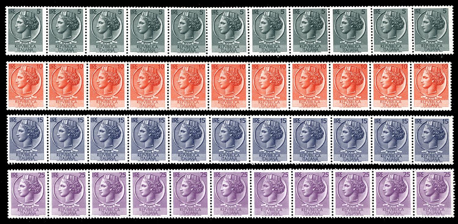 1955 - Siracusana, francobolli in bobina, filigrana stelle II tipo coricata, serie completa in strisce di 11 esemplari (B762/I-B769I), ... Read more