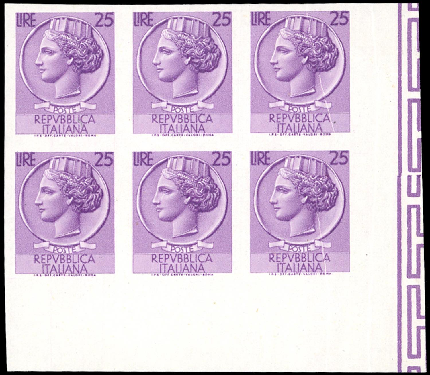 1961 - 25 lire violetto Siracusana, non dentellato, senza filigrana (CEI n.775/IIIa € 27.000), blocco di sei angolo di foglio, gomma originale integra, perfetto. Raro in blocchi. Cert. L.Raybaudi.