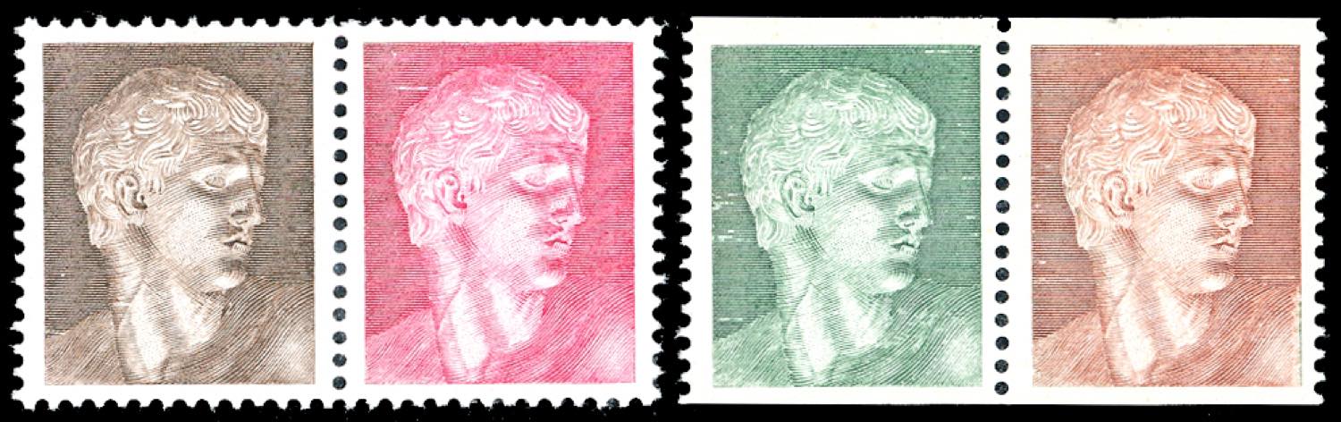 1957 - Donatello, prove di francobolli per macchinette, coppia con vignette in bruno e in rosso e coppia con vignetta in verde e in bruno ... Read more