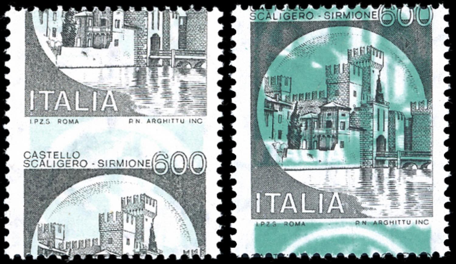 1980 - 600 lire Castelli (1523), due esemplari con appariscenti varietà di stampa e dentellatura, nuovi, gomma originale integra, ... Read more