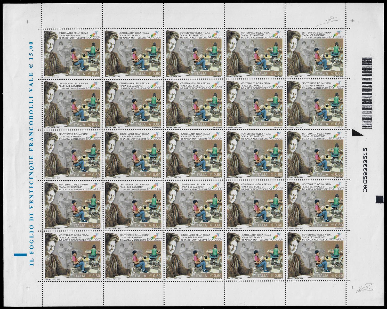 2007 - 0,60 € Montessori, cifra "7" di "1907" spostata in alto (2939a), foglio completo di 25 esemplari, gomma originale integra, perfetto. Cert. Diena.