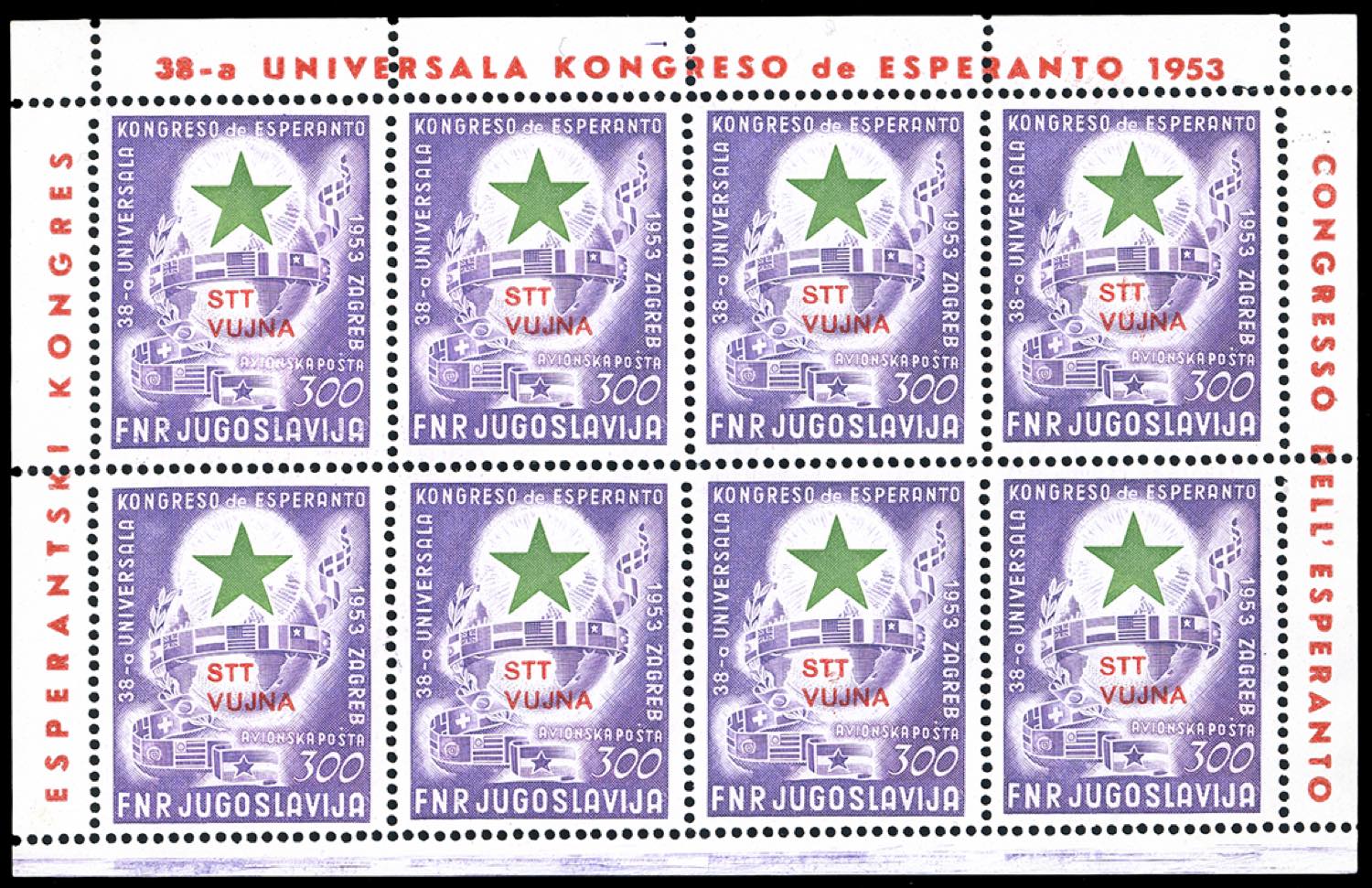 FOGLIETTI 1953 - 300 d. Esperanto, foglietto di 8 esemplari (4), gomma originale integra, nuovo, minime imperfezioni nei bordi foglio. ... Read more