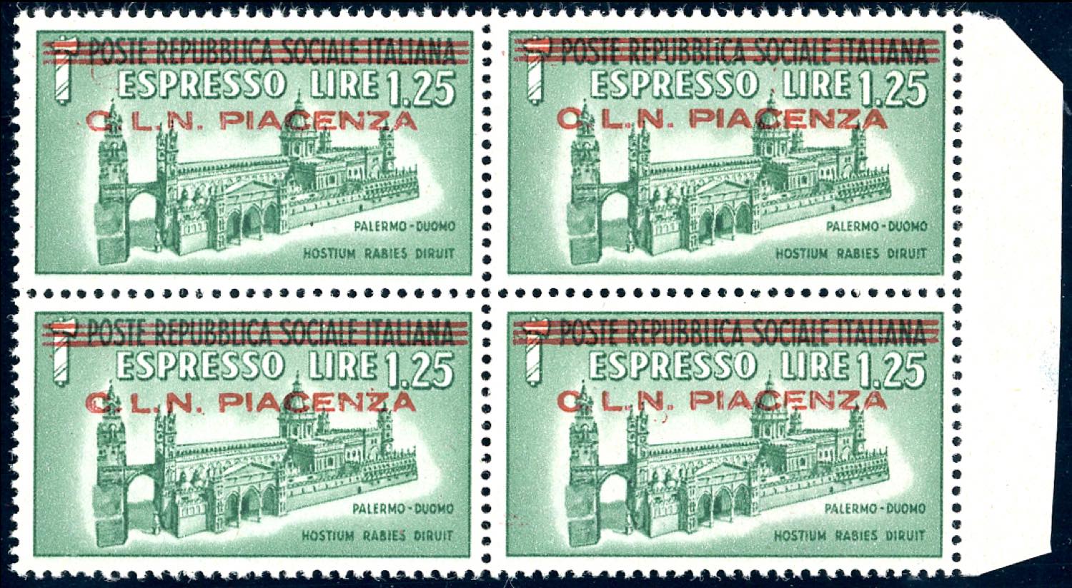 PIACENZA ESPRESSI 1945 - 1,25 lire Monumenti Distrutti, soprastampa "C.L.N. Piacenza" su una riga (Errani Raybaudi 78), blocco di quattro, ... Read more