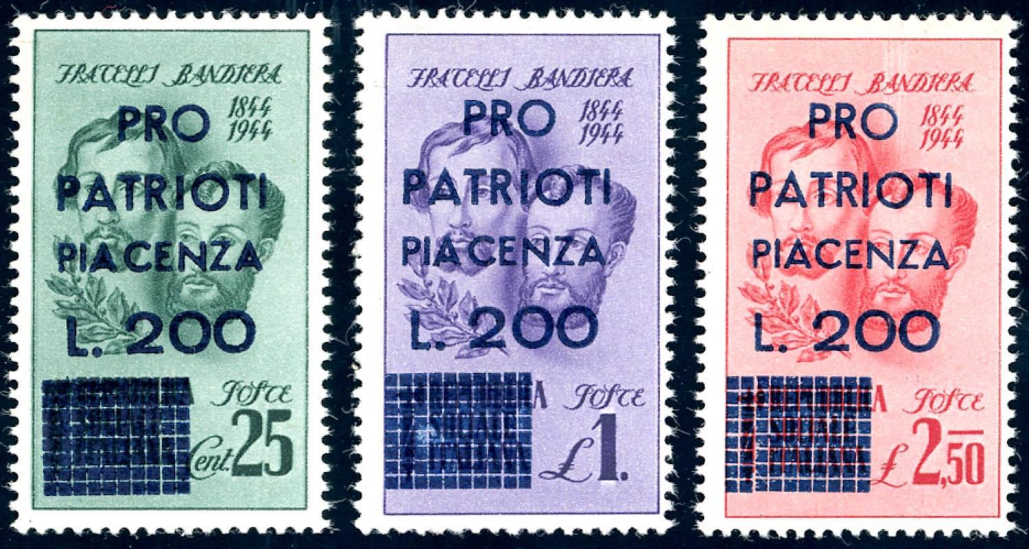 PIACENZA 1945 - Fratelli Bandiera, serie completa, soprastampati "Pro Patrioti Piacenza L.100" (Errani Raybaudi 99/101,CEI 12/14 € ... Read more