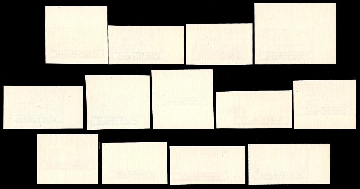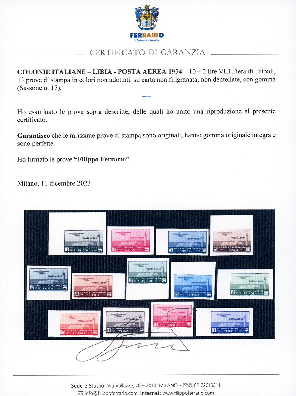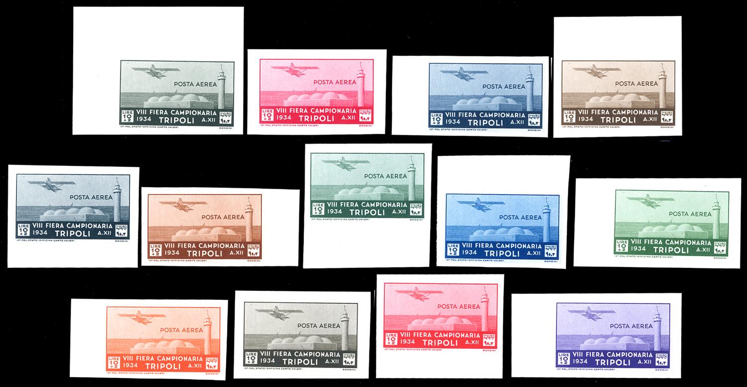 POSTA AEREA 1934 - 10 + 2 lire VIII Fiera di Tripoli (17), 13 prove di stampa in colori non adottati, su carta non filigranata, non dentellate, quasi tutte bordo/angolo di foglio, gomma originale integra, perfette e di ottima qualità. Insieme splendido ed inedito, di eccezionale rarità. Cert. Ferrario.