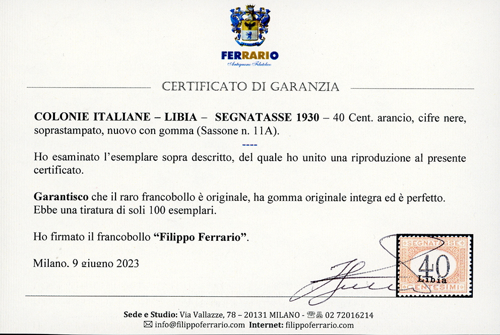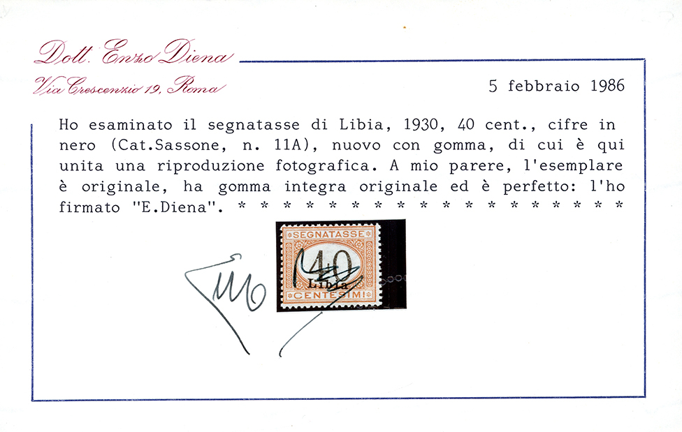 SEGNATASSE 1930 - 40 cent. arancio, cifre nere (11A), nuovo, gomma originale integra, perfetto. Freschissimo e splendido. Questo raro francobollo, di cui esistono solo 100 esemplari provenienti da un unico foglio, non esiste centrato, qualitativamente questo è uno dei migliori esistenti. Cert. Ferrario ed Enzo Diena 1986.