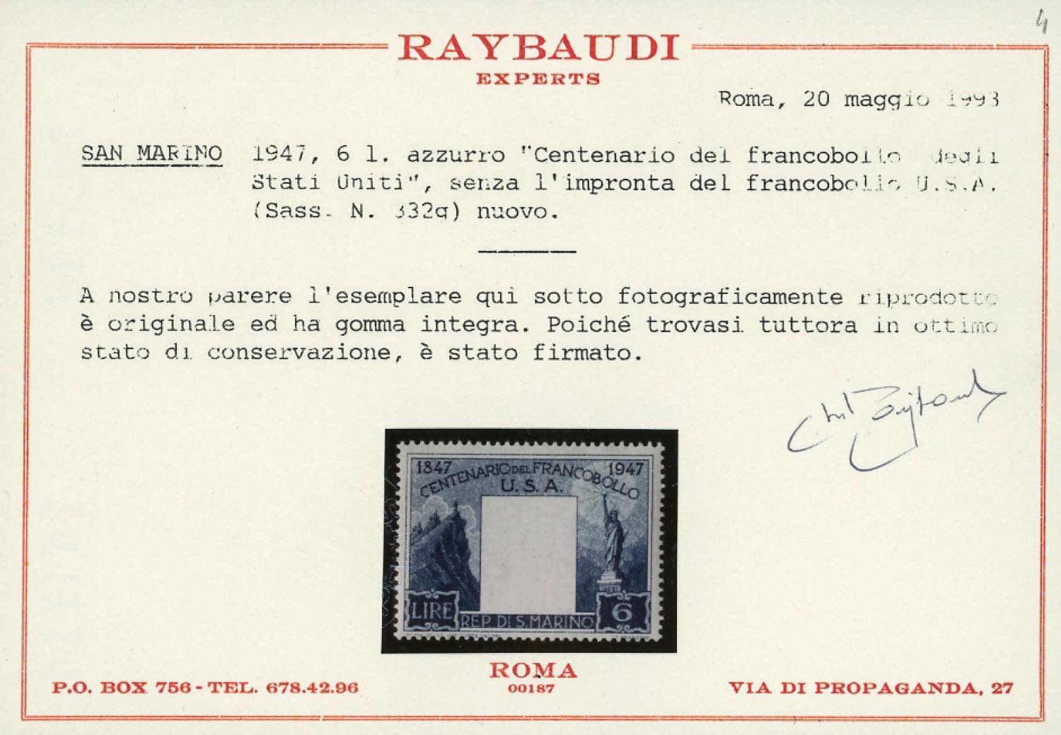 1947 - 6 lire Centenario francobollo Stati Uniti, senza la stampa del francobollo USA (332h), gomma integra, perfetto. Splendido e molto raro. Ferrario, cert. Raybaudi.