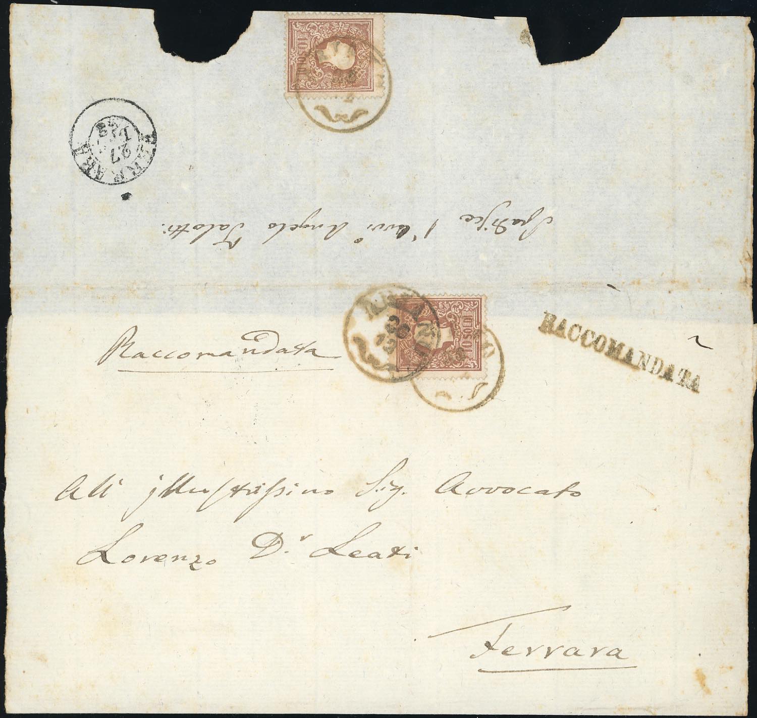 ARIANO, CO rosso brunastro punti 9 + RACCOMANDATA punti 7 - 10 soldi, I tipo (26), un esemplare sul fronte, lieve piega, ed uno al verso, perfetto, su sovracoperta di lettera raccomandata del 26/12/1858 per Ferrara, nello Stato Pontificio. Non comune.