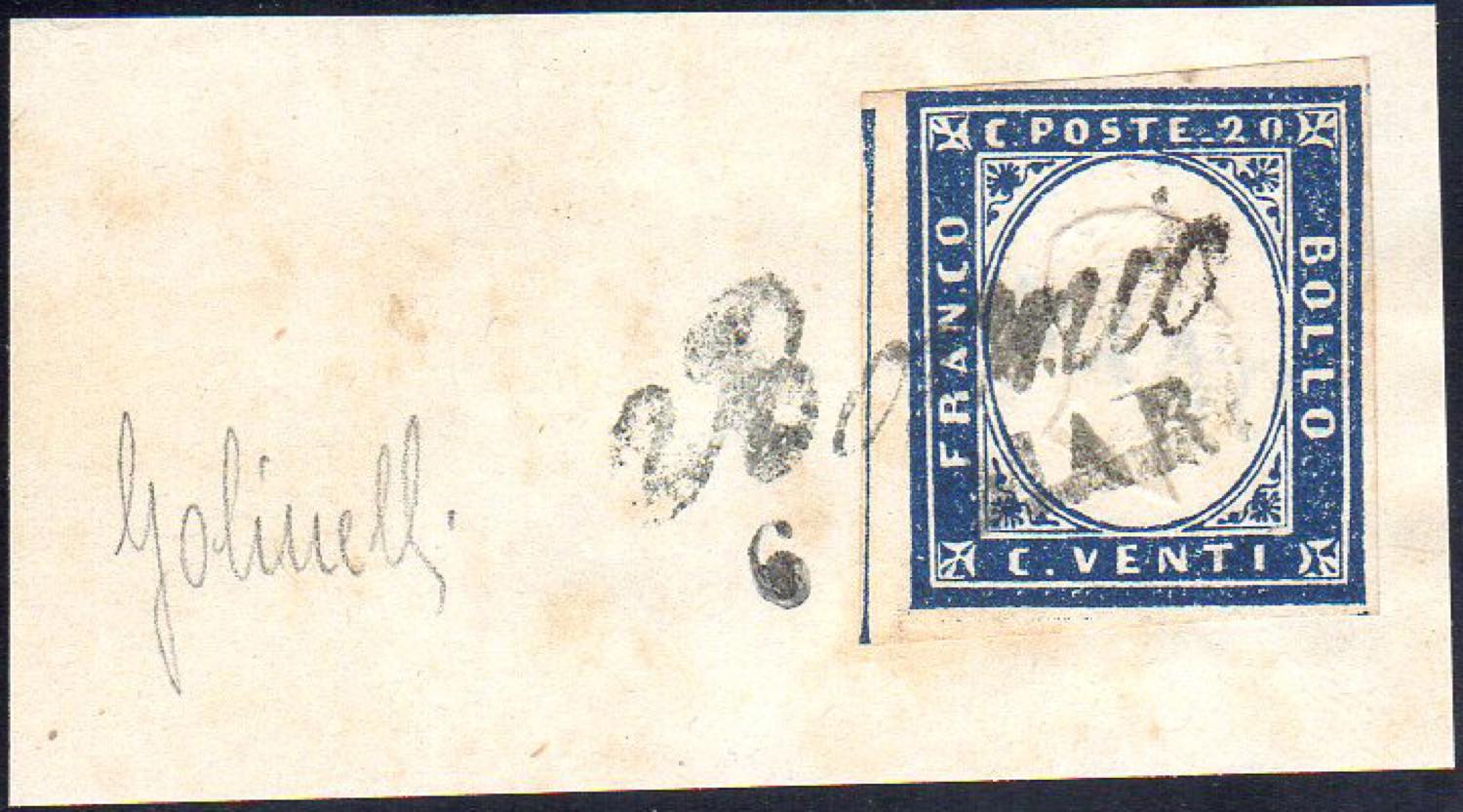 BORMIO, Cor. punti 10 - 20 cent. (Sardegna 15Cb), perfetto, usato su frammento il 6/3/1860. Golinelli.