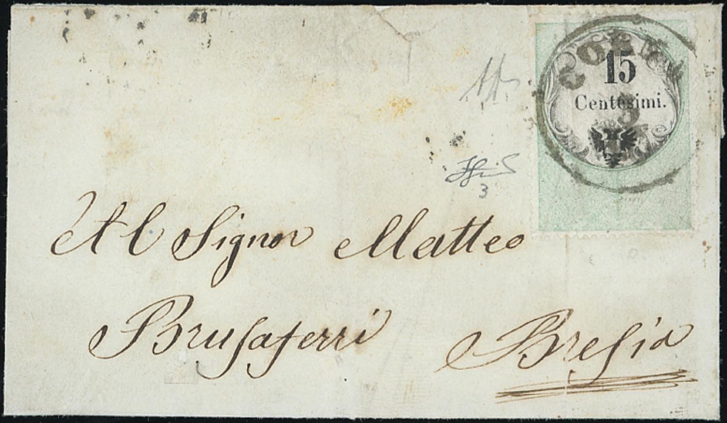 CORNA, C1 punti 12 - 15 cent. marca da bollo tipografica (3), perfetta, su sovracoperta di lettera del 8/10 per Brescia. Piega antecedente ... Read more