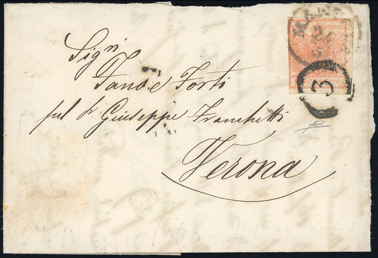 DISTRIBUZIONE 3, 2CO coannullatore - 15 cent. (20), perfetto, su sovracoperta di lettera da Mantova 24/5/1858 a Verona, bollo di ... Read more