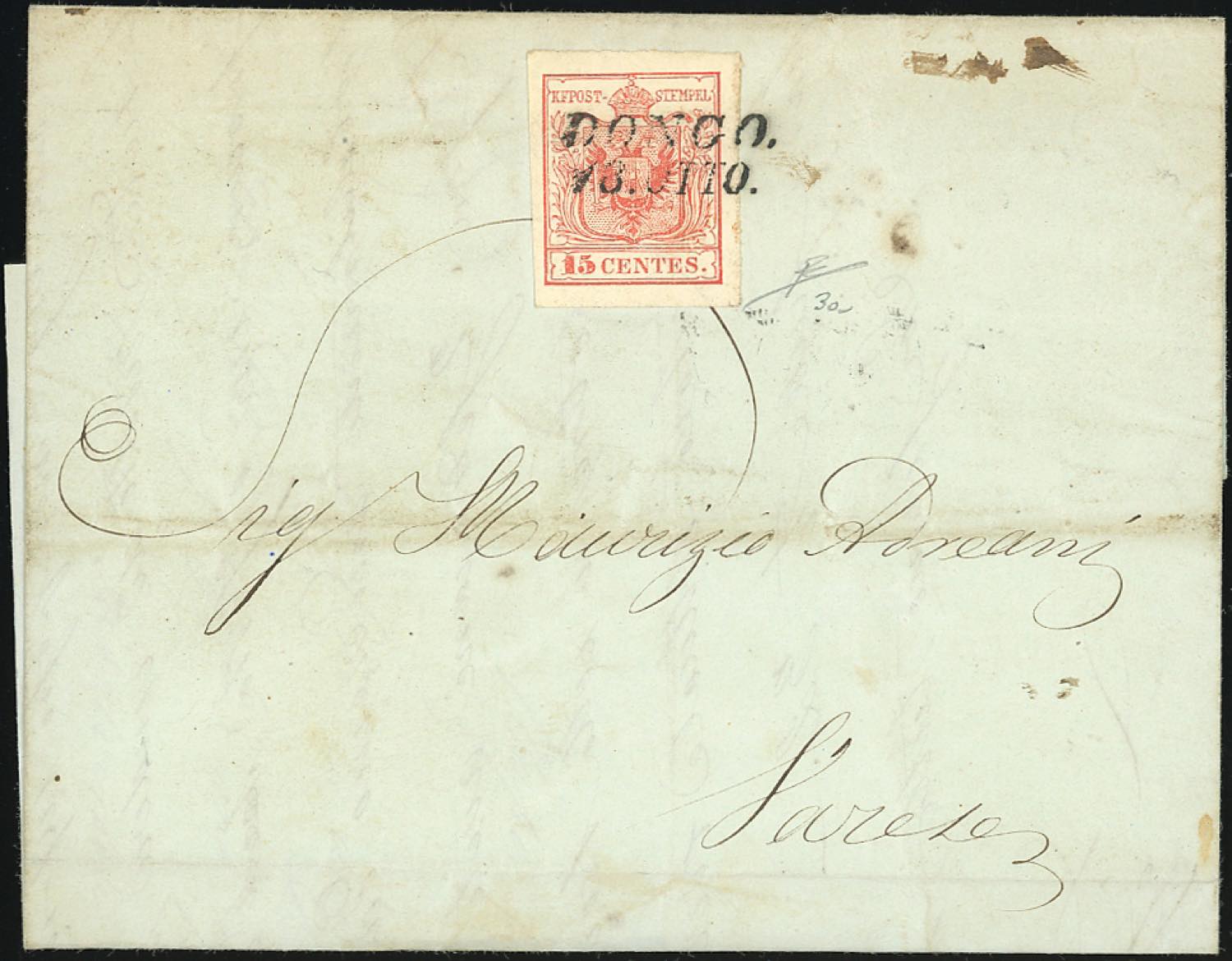 DONGO, SI punti 5 - 15 cent. (3a), perfetto, su lettera del 13/10/1850 per Varese. R.Diena.