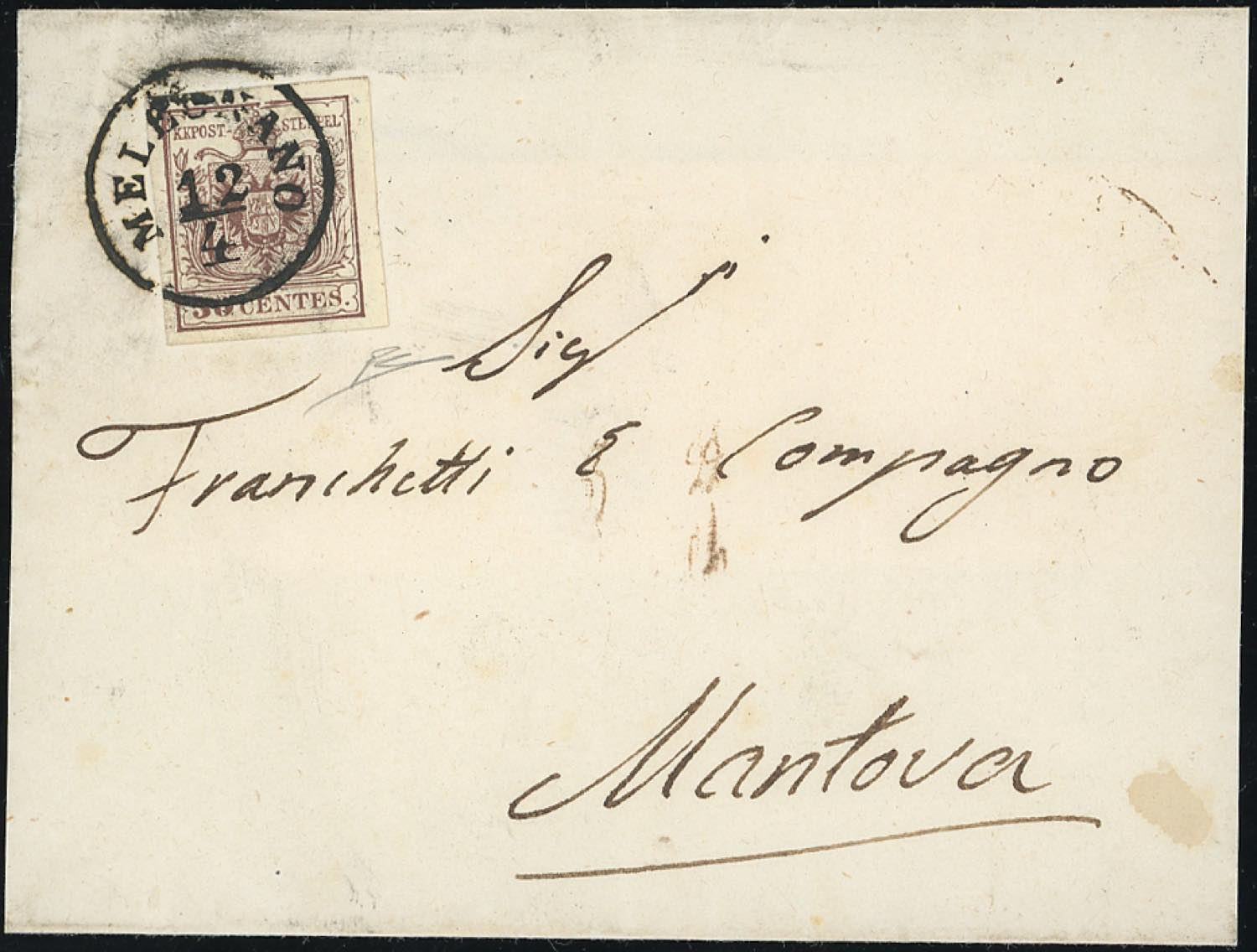 MELEGNANO, C1 punti 7 - 30 cent. (21), perfetto, su sovracoperta di lettera del 12/4 per Mantova. R.Diena.