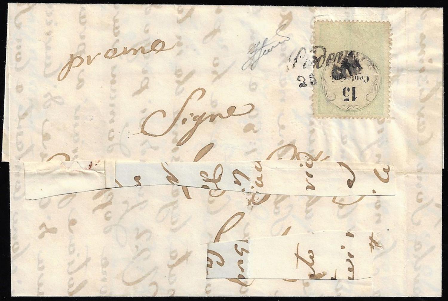 PIADENA, Cor punti 7 - 15 cent. marca da bollo tipografica (3), perfetta, su lettera del 25/6, indirizzo asportato. Ferrario.