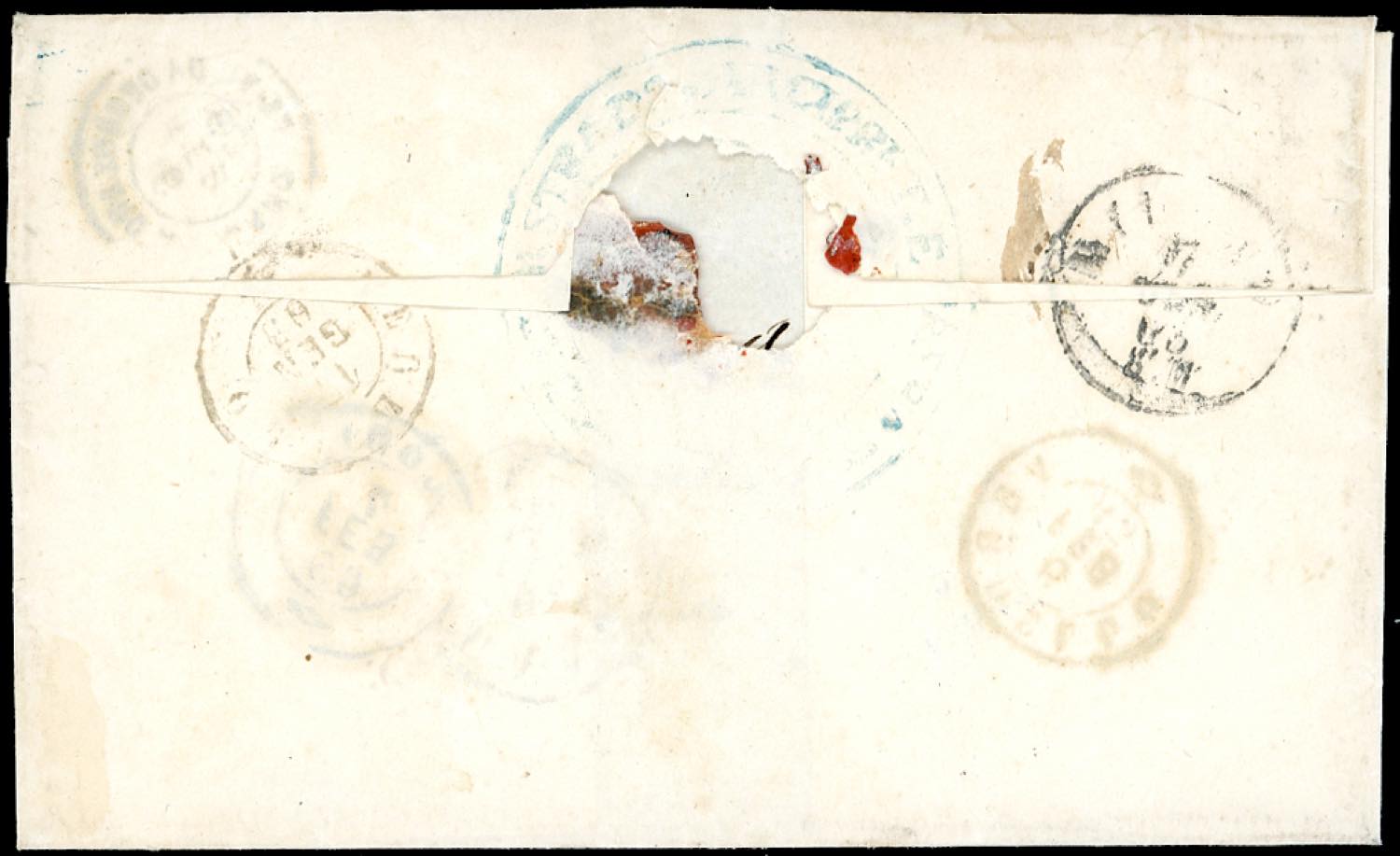 SECUGNAGO, OSIO SOTTO, punti 12+11 - 15 cent. tipo Sardegna (11), leggermente corto, su sovracoperta di lettera da Secugnago 12/1/1863 a Boltiere. La sovracoperta è stata rivoltata e riutilizzata con 15 cent. tipo Sardegna (11), perfetto, da Osio di Sotto 5/2/1863 a San Martino in Strada. Interessante e molto rara!