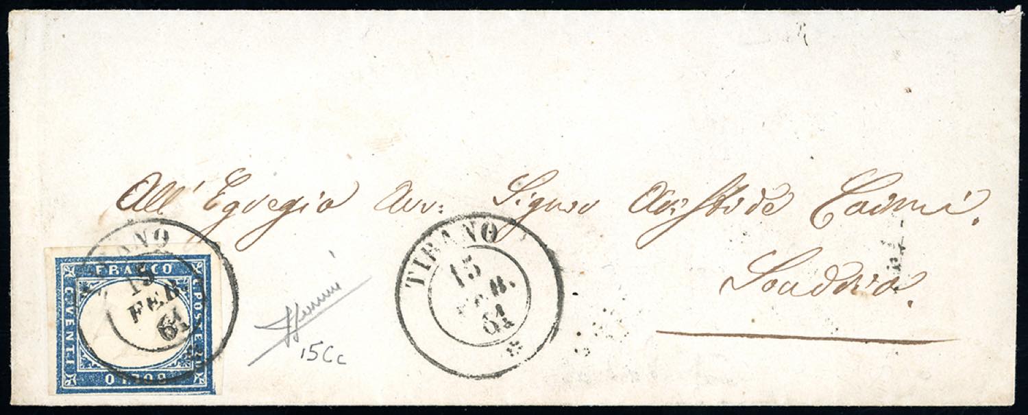 TIRANO, sardo italiano punti 13 - 20 cent. azzurro grigio, IV emissione di Sardegna (15Cc), perfetto, usato su fresca busta del 15/2/1861 ... Read more