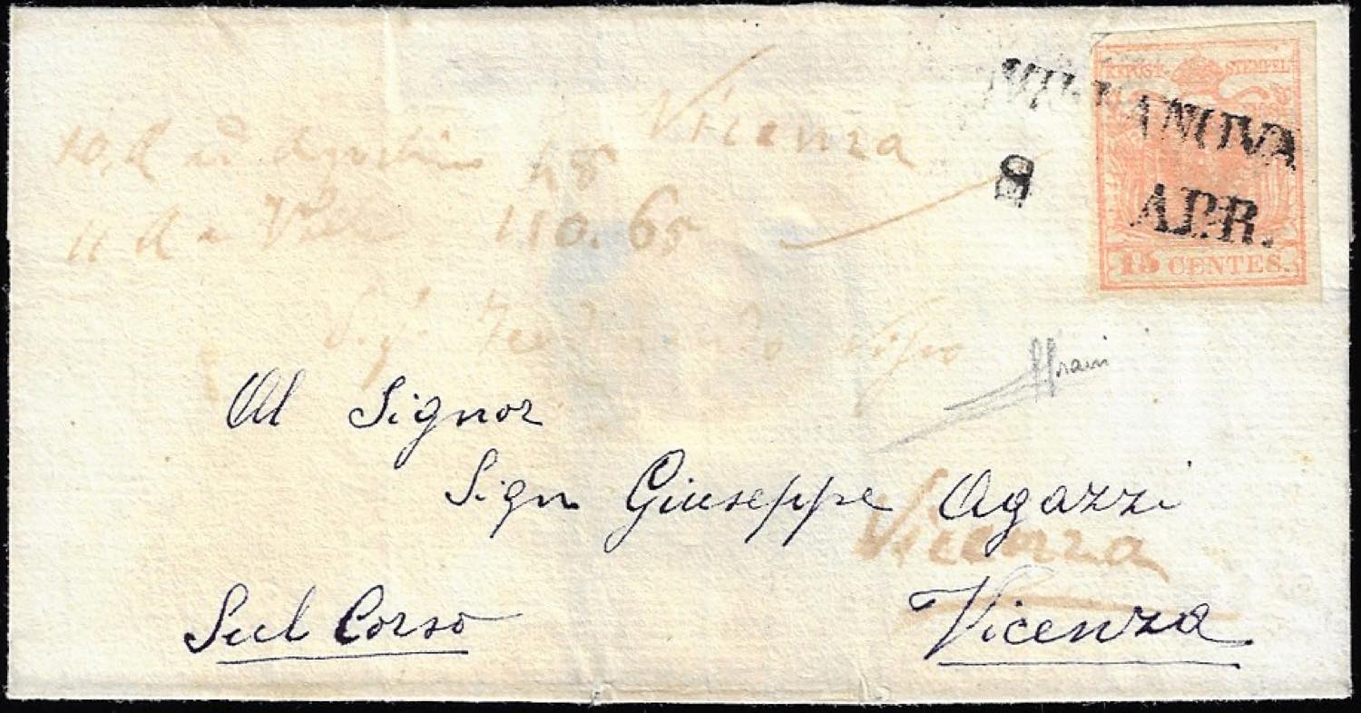 VILLANOVA, SD punti 10 - 15 cent. (5), perfetto, su sovracoperta di lettera del 8/4 per Vicenza, bollo d'arrivo. Sorani.
