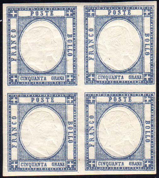 Lot 482 - 1861 - 50 grana ardesia oltremare (24d), blocco di quattro, ...