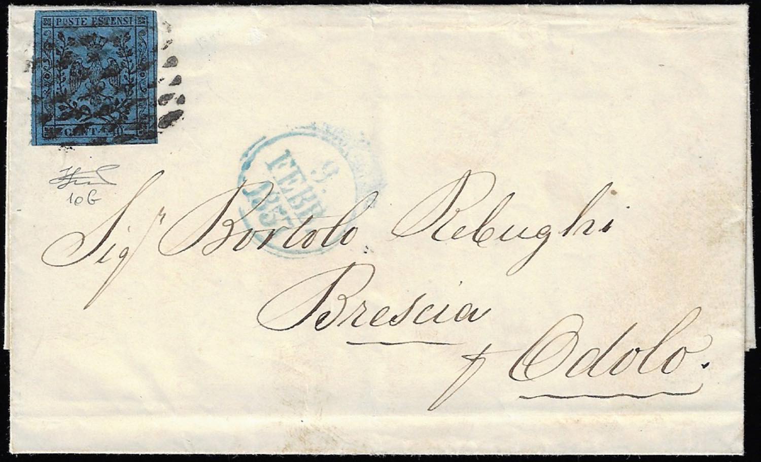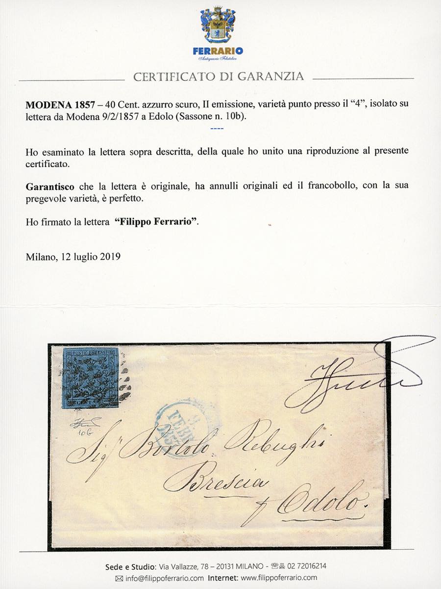 1857 - 40 cent. azzurro scuro, punto vicino al "4" (10b), perfetto, su lettera da Modena 9/2/1857 ad Edolo. Bella e rara! Cert. Ferrario.