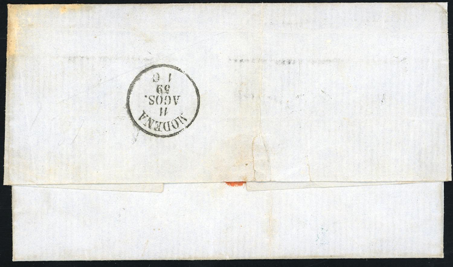1859 - 5 cent. verde, punto dopo le cifre (7), coppia, un esemplare corto in basso, su sovracoperta di lettera da Pavullo, annullo in cartella punti R3, a Nonantola, al verso transito di Modena 11/8/1859. Rarrissima applicazione della tariffa ancora ducale, successivamente all'introduzione delle tariffe sarde del 1/8/1859, impreziosita dell'annullo. Si tratta dell'unica lettera nota di questo ufficio nel periodo Governo Provvisorio, precedente all'emissione dei francobolli.