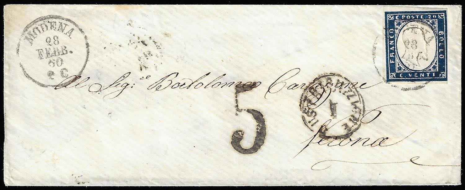 1860 - 20 cent. azzurro scurissimo (Sardegna 15C), sfiorato a destra, su fresca busta da Modena 28/2/1860 a Verona, tassata 5 soldi. Interessante lettera da un ufficio del Cisappennino in periodo di regie Provincie dell'Emilia.