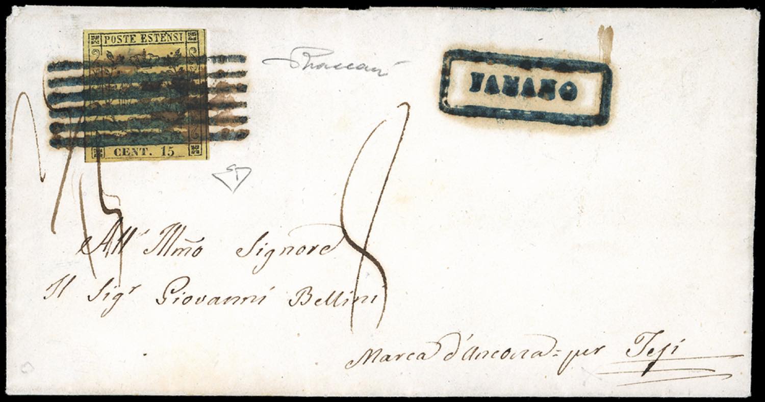 FANANO, 6 sbarre + cartella nero azzurrastro oleoso punti R1 - 15 cent. giallo (3), perfetto su fresca lettera affrancata ... Read more