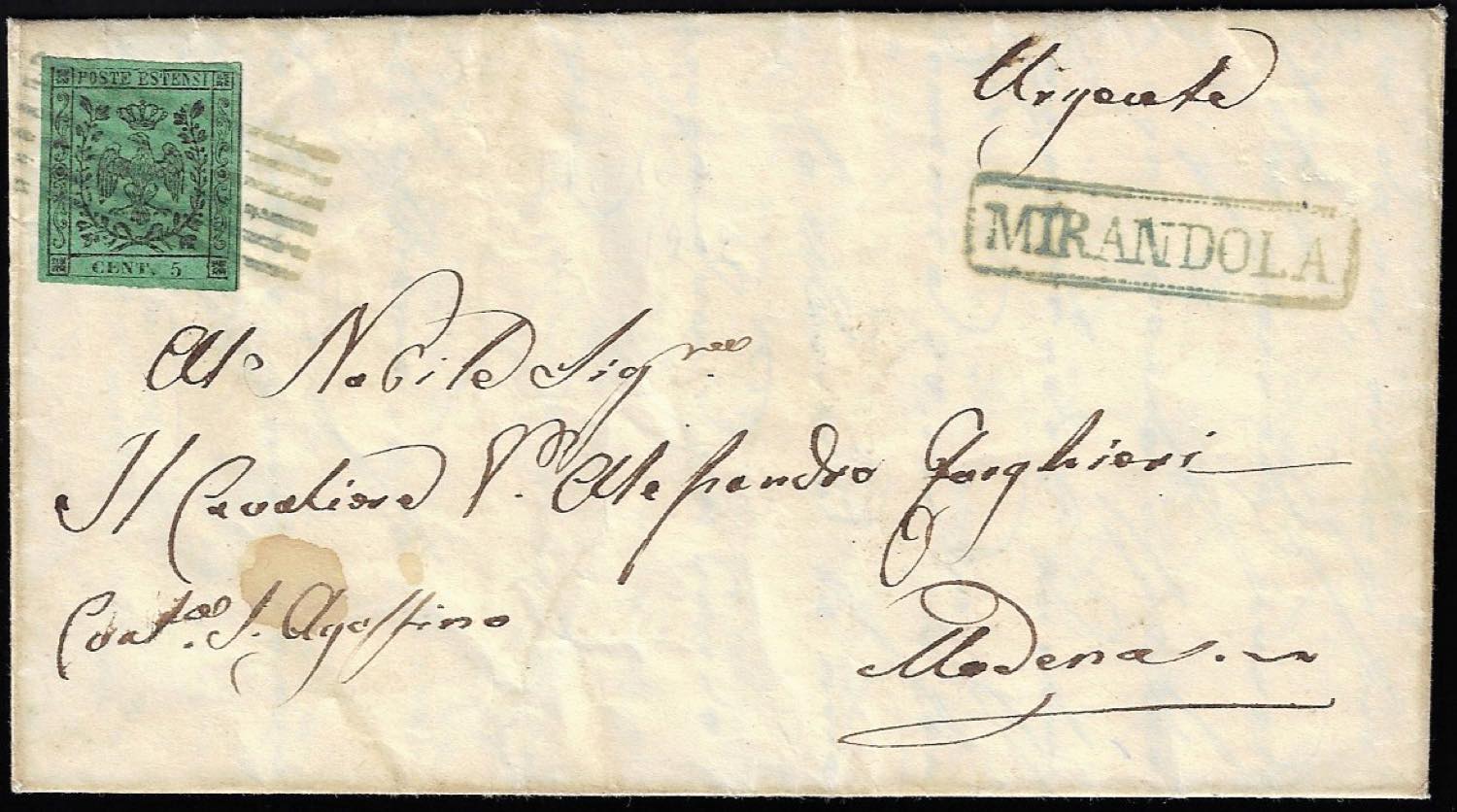 MIRANDOLA, 6 sbarre + cartella azzurri punti 10 - 5 cent. (1), perfetto, su lettera del 13/5/1853 per Modena.