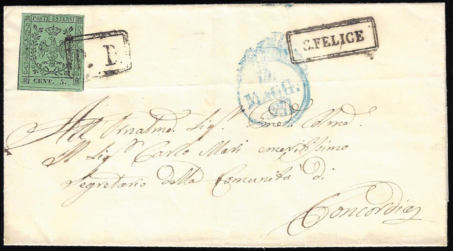 S.FELICE, PD punti 13 - 5 cent. (7), perfetto, su sovracoperta di lettera per Concordia, bollo in transito di Modena del 5/1857.