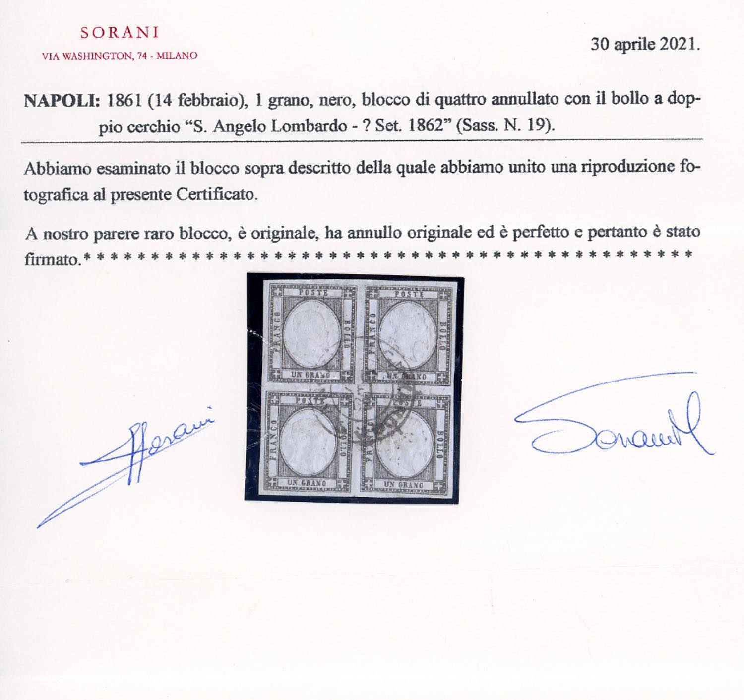 1861 - 1 grano nero (19), blocco di quattro, perfetto, usato a S.Angelo dei Lombardi settembre 1862. Raro. Cert. Sorani.