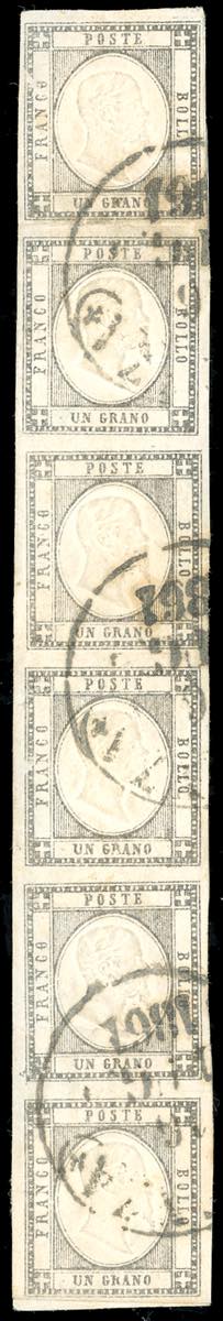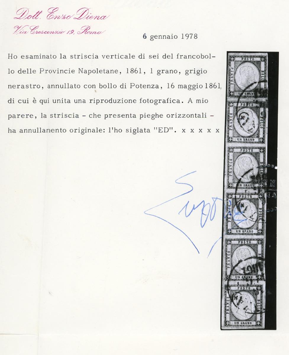 1861 - 1 grano grigio scuro (19a), striscia verticale di sei, ben marginata, lievi pieghe orizzontali che interessano due francobolli, usata a Potenza 16/5/1861. Molto rara e di ottimo aspetto. Cert. E.Diena.