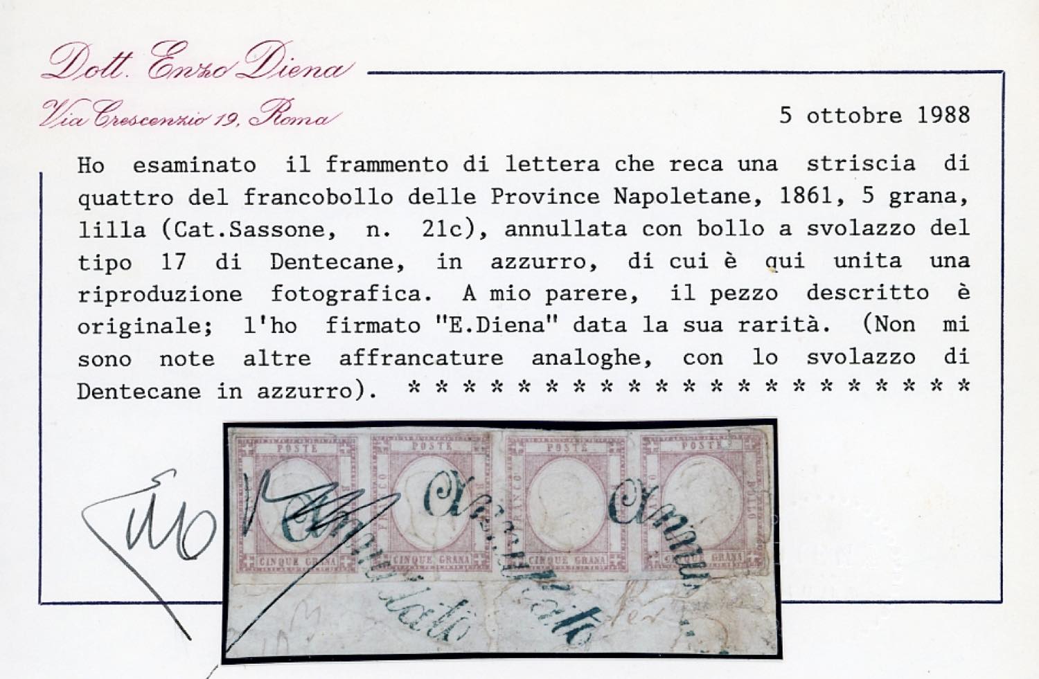 1861 - 5 grana lilla (21c), striscia di quattro, difetti, usata su frammento con lo svolazzo azzurro tipo 17 di Dentecane, punti R2. Insieme unico, di grande rarità. Cert. E.Diena.