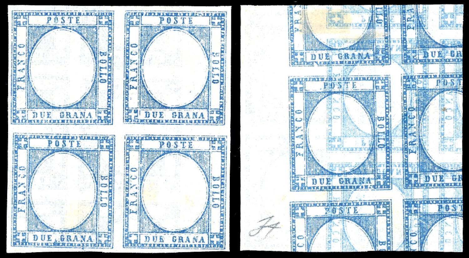 1861 - 2 grana azzurro (20), prova di macchina su carta sottile, stampa multipla al verso, senza effigie, senza gomma, perfetta. Interessante e non comune. Ferrario. Ex coll. Imperato.